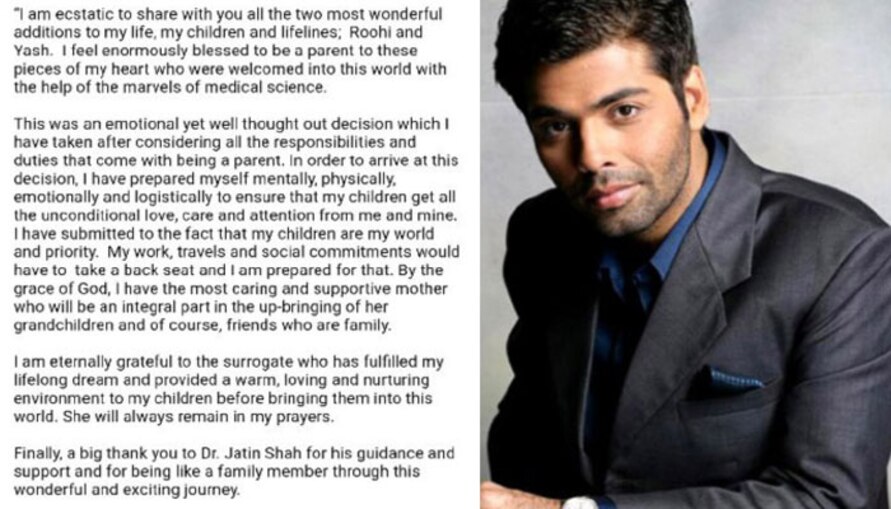 সারোগেসি আইনে বদল আনতে কেন্দ্রীয় সরকার গত বছর আগস্টে বিল পেশ করে। শারীরিক প্রতিবন্ধকতা না থাকলে সারোগেসির মাধ্যমে বাবা হওয়া যাবে না, এই বিল জমা দেওয়া হয়। আমির খান এবং শাহরুখ খানের পর গত বছর তুষার কাপুরও সারোগেসির পথই বেছে নেন। আর তুষার কাপুর বাবা হওয়ার পরই করণ নিজের মনের ইচ্ছা প্রকাশ করেন, প্রকাশ্যে বলেন তিনিও বাবা হতে চান। আজ দুই সন্তানের বাবা তিনি। রবিবার তাঁর ব্লগে এই খবর নিজেই জানান তিনি।