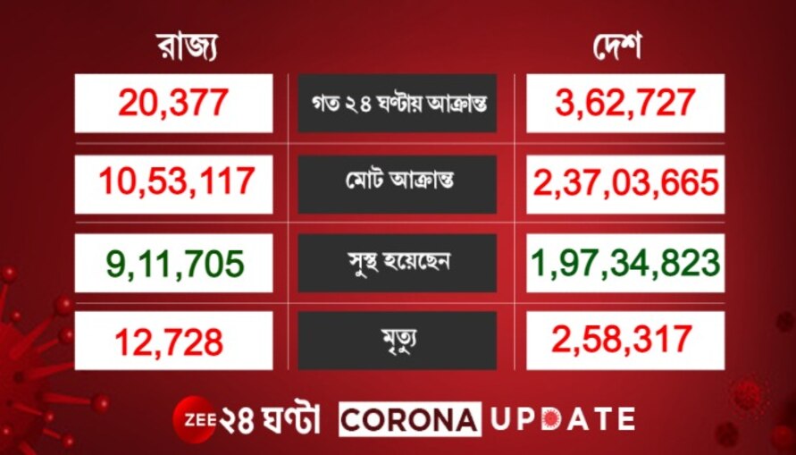 স্বাস্থ্যমন্ত্রকের প্রকাশিত রিপোর্ট অনুযায়ী, ২৪ ঘণ্টায় সুস্থ হয়েছেন ৩ লাখ ৫২ হাজার ১২১ জন। নতুন করে সংক্রমণ ঘটায়, মোট আক্রান্তের সংখ্যা হয়েছে ২ কোটি ৩৭ লাখ ০৩ হাজার ৬৬৫। করোনা মুক্ত হয়েছে ১ কোটি ৯৭ লাখ ৩৪ হাজার ৮২৩। মোট মৃতের সংখ্যা গিয়ে দাঁড়িয়েছে ২ লাখ ৫৪ হাজার ৩১৭-তে। এখনও পর্যন্ত সক্রিয় রোগী রয়েছেন ৩৭ লাখ ১০ হাজার ৫২৫ জন। অর্থাৎ সামান্য বেড়েছে সক্রিয় রোগীর সংখ্যা।