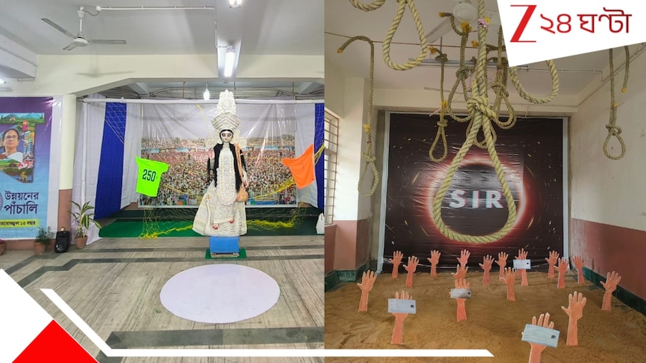 জি ২৪ ঘণ্টা ডিজিটাল ব্যুরো: সরস্বতী পুজোতেও SIR!বালিগঞ্জ সায়েন্স কলেজে সরস্বতী পুজোর থিম এসআইআর। এসআইআর-এর কারণে বাংলার মানুষের হয়রানি, মাধ্যমিকের অ্যাডমিট কার্ড ব্যবহার করতে না দেওয়া, আত্মহত্যা এই সবকিছুই উঠে এসেছে বাগদেবী আরাধনার থিমে৷ মায়ের মূর্তির পিছনে তৈরি করা হয়েছে ফুটবল বার। যেখানে লেখা ২৫০+। জার্সিতে লেখা, খেলা হবের টার্গেট। এর সঙ্গেই সারাক্ষণ ব্যাকগ্রাউন্ডে বাজছে উন্নয়নের পাঁচালি। যারপরই প্রশ্ন উঠছে, বিদ্যার দেবীর কাছে ভোট জয়ের প্রার্থনা?