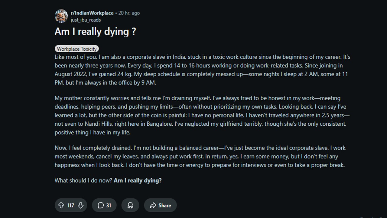 নাম প্রকাশে অনিচ্ছুক চাকুরিজীবী লিখেছেন, 'আপনাদের বেশিরভাগের মতোই আমিও ভারতে এক কর্পোরেট দাস, আমার কেরিয়ারের শুরু থেকেই এক বিষাক্ত কর্মসংস্কৃতিতে আটকে আছি। প্রায় তিন বছর হয়ে গিয়েছে। প্রতিদিন, আমি ১৪ থেকে ১৬ ঘন্টা কাজ করি অথবা কাজের সঙ্গে সম্পর্কিত কাজেই থাকি। ২০২২ সালের অগাস্টে চাকরিতে যোগ দেওয়ার পর থেকে আমার ওজন ২৪ কেজি বেড়ে গিয়েছে। আমার ঘুমের সময়ের কোনও ঠিকই নেই। কখনও রাত আমি ২ টোর সময়ে ঘুমাই তো কখনও রাত ১১টা। কিন্তু আমি অফিস চলে আসি সকাল ৯ টার মধ্যে।'