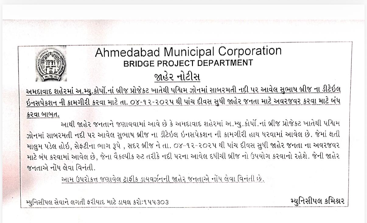 Ahmedabad News: અમદાવાદ મહાનગર પાલિકાએ સૌથી વ્યસ્ત ગણાતા સુભાષબ્રિજને પાંચ દિવસ માટે બંધ કરવાનો નિર્ણય લેતા વાહન ચાલકો પરેશાન થઈ ગયા છે. મનપા દ્વારા રિપેરિંગ કામને લઈને અચાનક બ્રિજ બંધ કરવાનો નિર્ણય લેવામાં આવ્યો છે. એએમસીએ આપેલી માહિતી મુજબ આ બ્રિજ 4 ડિસેમ્બરથી આગામી પાંચ દિવસ માટે બંધ રહેશે.