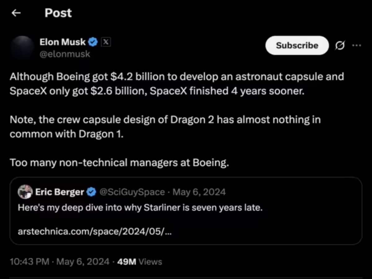 મસ્કે પોતાની પોસ્ટમાં કહ્યું કે 'જોકે બોઇંગને અવકાશયાત્રી કેપ્સ્યુલ વિકસાવવા માટે $4.2 બિલિયન મળ્યા હતા અને સ્પેસએક્સને ફક્ત $2.6 બિલિયન મળ્યા હતા, સ્પેસએકસે 4 વર્ષ પહેલાં કામ પૂર્ણ કર્યું હતું. નોંધ કરો કે, ડ્રેગન 2 ની ક્રૂ કેપ્સ્યુલ ડિઝાઇન ડ્રેગન 1 સાથે લગભગ કોઈ સમાનતા ધરાવતી નથી. બોઇંગમાં ઘણા બધા બિન-તકનીકી મેનેજરો છે.'