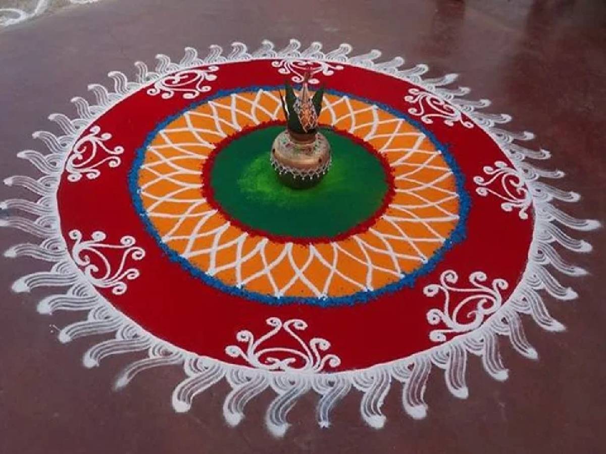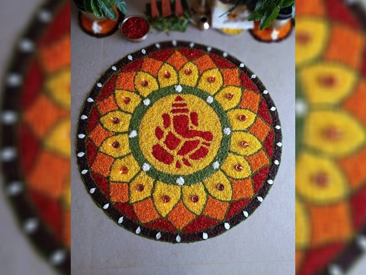 घर के बाहर इस रंगोली को बनाने से घर की खूबसूरती बढ़ सकती है. इस रंगोली को बनाना भी बेहद आसान है.