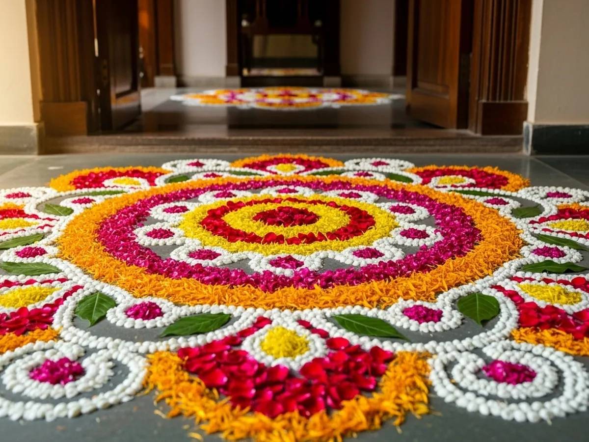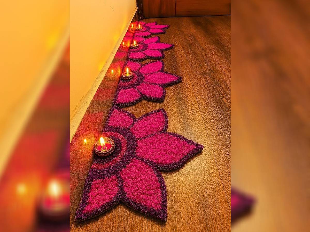 चौखट की खूबसूरती बढ़ाने के लिए आप फूलों की रंगोली बना सकते हैं. फूलों की ये रंगोली आपके घर की खूबसूरती को बढ़ा देते हैं.
