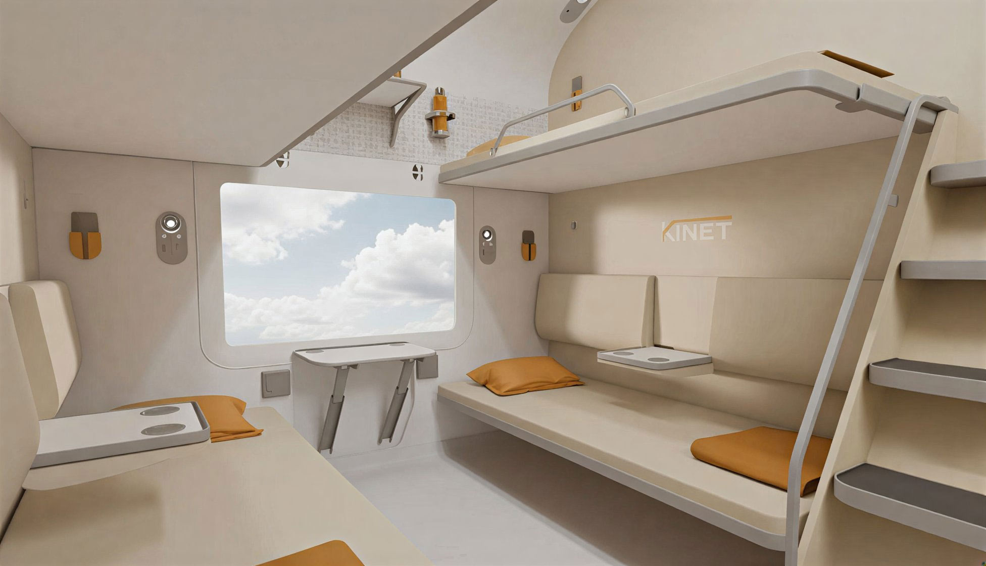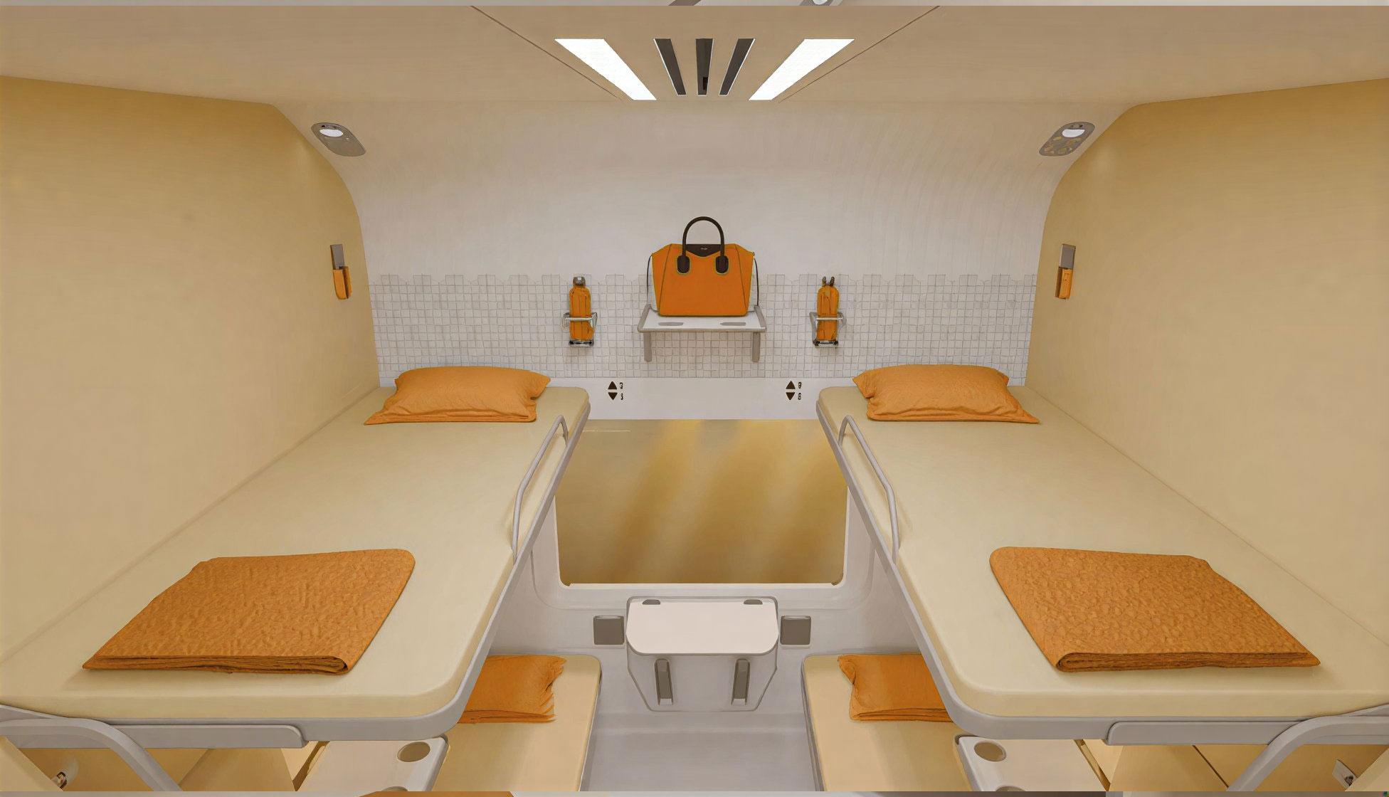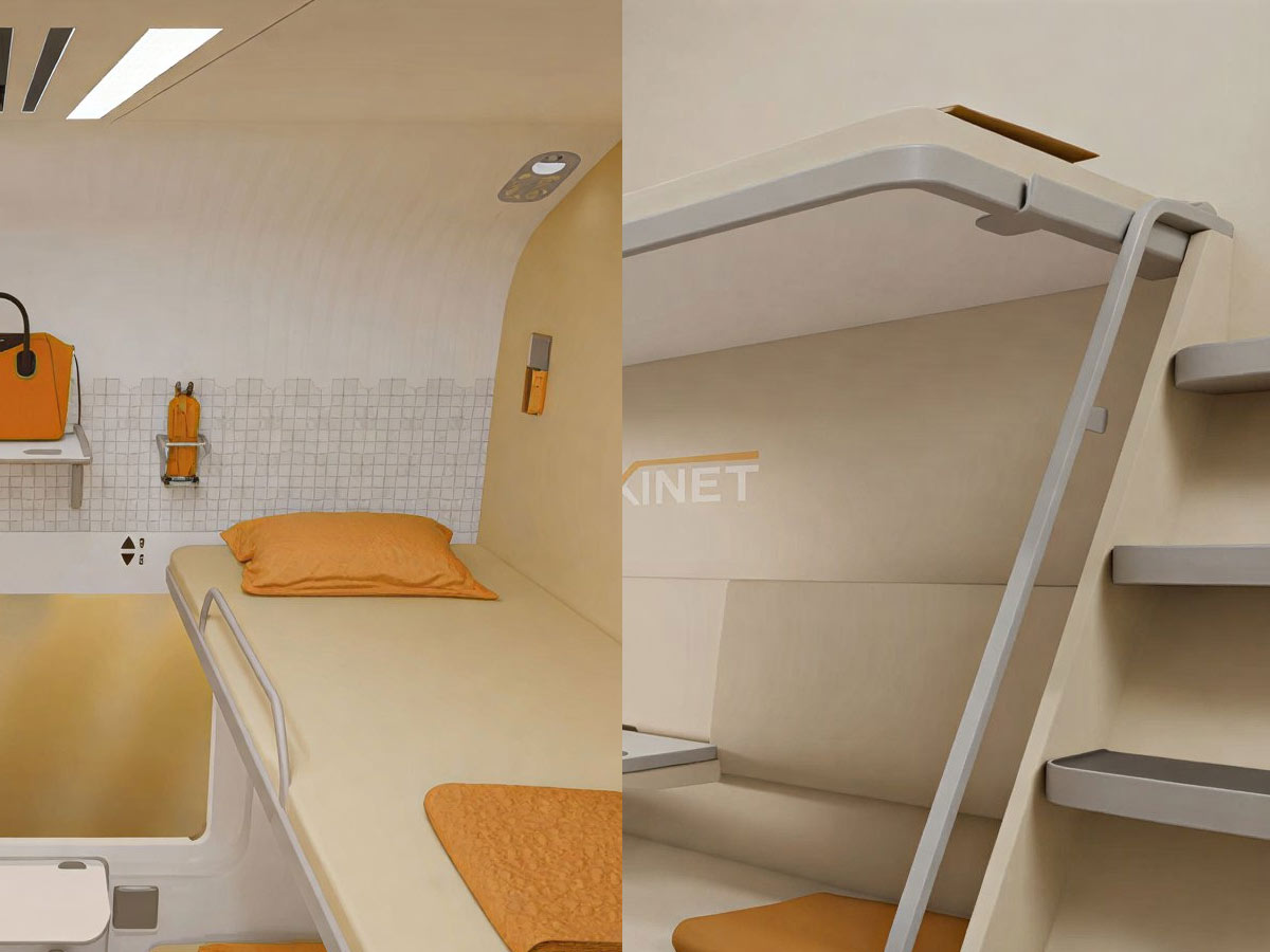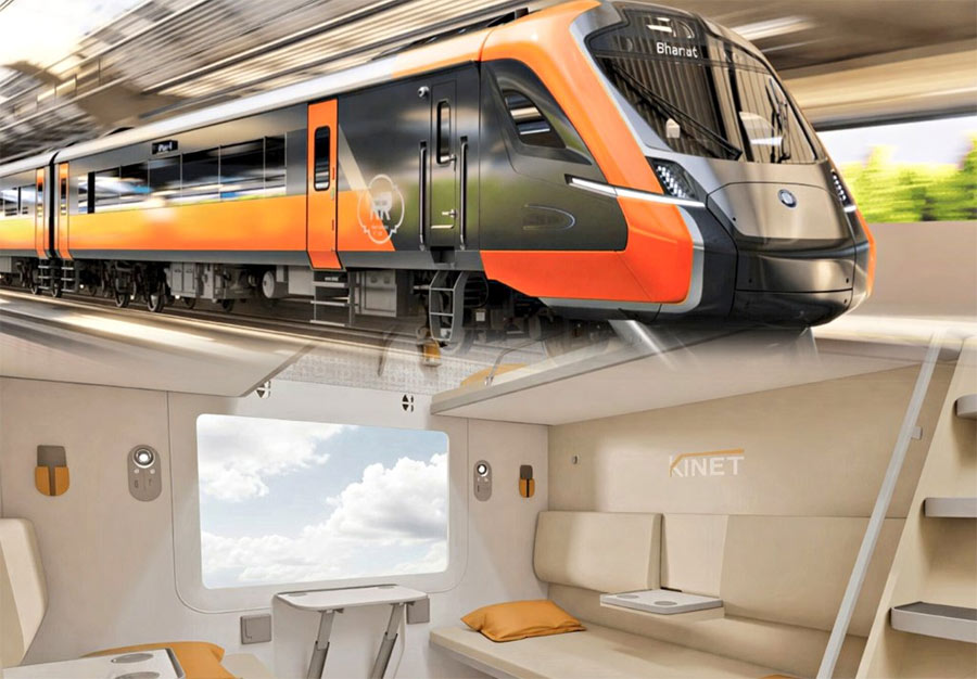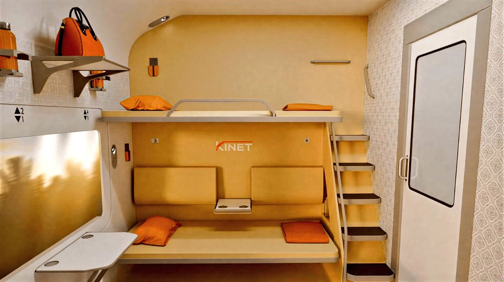 काइनेट रेलवे सॉल्यूशंस की तरफ से फर्स्ट एसी के चार-बर्थ वाले कोच का डिजाइन दिखाया गया. यह कोच आरामदायक और ज्यादा ओपन है. अपर बर्थ तक पहुंचने के लिए इसमें बहुत ही शानदार सीढ़ियां दी गईं हैं. सुविधाओं की बात करें तो हर सीट पर USB पोर्ट, पर्सनल रीडिंग लाइट और स्मार्ट स्टोरेज है.