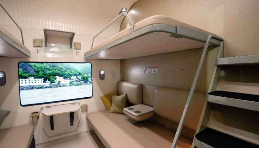 सीढ़ी के नीचे छोटी जगह किताब रखने के लिए, फोन या घड़ी रखने के लिए दी गई है. काइनेट रेलवे सॉल्यूशंस रूस की कंपनी TMH और भारत की रेल विकास निगम लिमिटेड (RVNL) का ज्वाइंट वेंचर है. इसे रेलवे के लिए 120 वंदे भारत स्लीपर ट्रेन (1920 कोच) बनाने और मेंटीनेंस की जिम्मेदारी मिली है.
