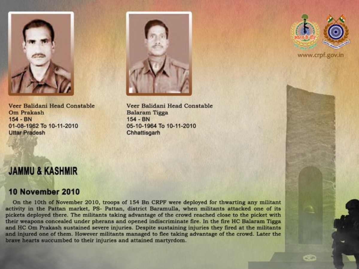 जम्मू-कश्मीर के बारामुला जिले के पट्टन बाजार में 10 नवंबर 2010 को 154 बटालियन सीआरपीएफ के जवान आतंकियों की किसी भी गतिविधि को रोकने के लिए तैनात थे. भीड़ का फायदा उठाकर आतंकियों ने पिकेट पर अंधाधुंध गोलीबारी शुरू कर दी. इस हमले में हेड कांस्टेबल बलराम टिग्गा और हेड कांस्टेबल ओमप्रकाश गंभीर रूप से घायल हो गए थे. घायल होने के बावजूद दोनों ने हिम्मत नहीं हारी और जवाबी फायरिंग की. उन्होंने एक आतंकी को घायल कर दिया. अंत में दोनों वीर जवान मातृभूमि की रक्षा में शहीद हो गए. सीआरपीएफ इन बहादुरों को बार-बार नमन करती है.
