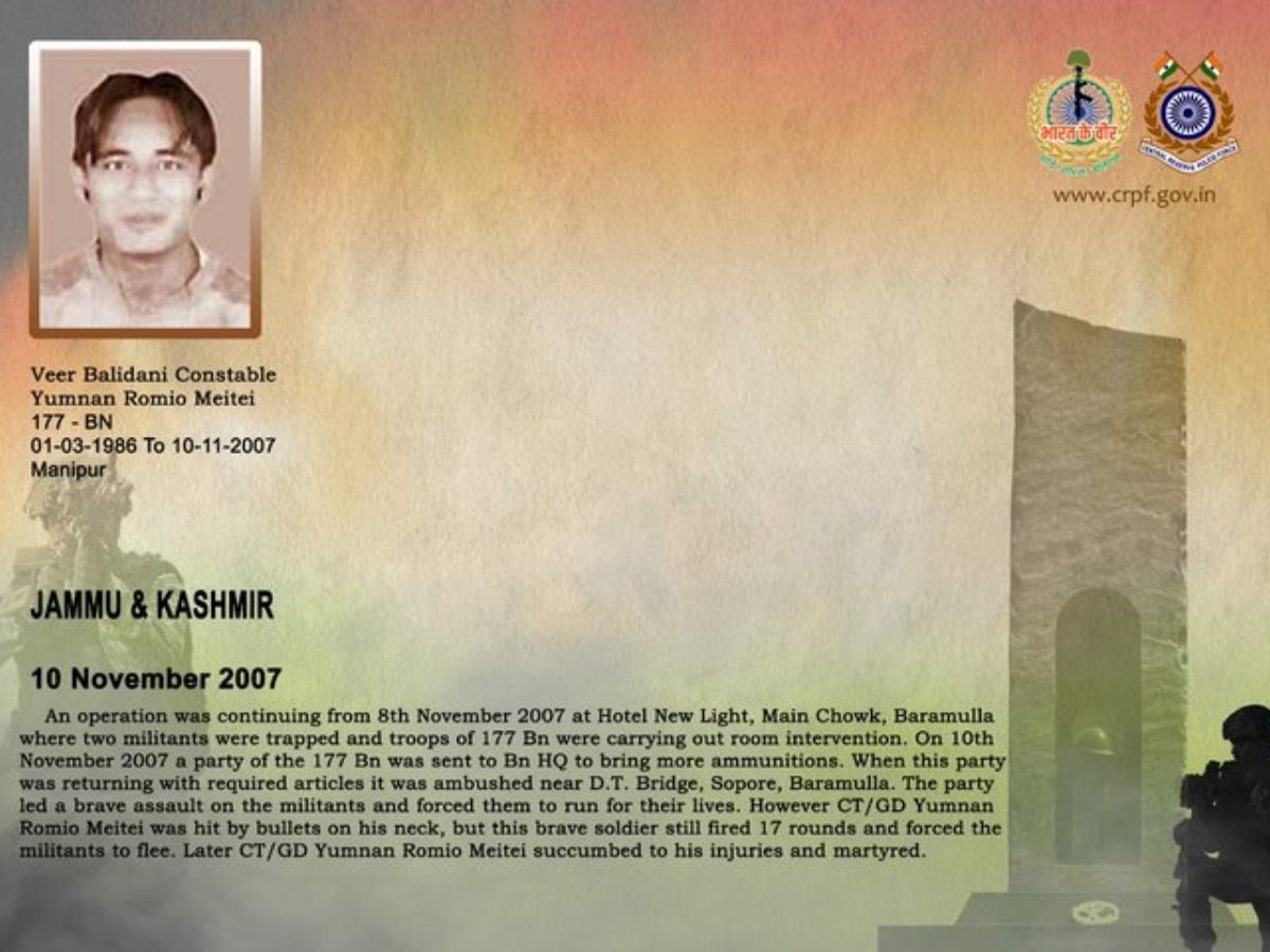बारामुला जिले में ही 10 नवंबर 2007 को 177 बटालियन सीआरपीएफ के जवान एक ऑपरेशन चला रहे थे. तभी आतंकियों ने घात लगाकर हमला कर दिया. कांस्टेबल युमनन रोमियो मैतेई को गोली लगी, लेकिन उन्होंने हार नहीं मानी. घायल अवस्था में ही उन्होंने 17 राउंड फायर किए और आतंकियों को भागने पर मजबूर कर दिया. इस बहादुरी भरे कार्य के बाद वे शहीद हो गए. मातृभूमि के लिए सर्वोच्च बलिदान देने वाले इस वीर सपूत को सीआरपीएफ बार-बार नमन करती है.