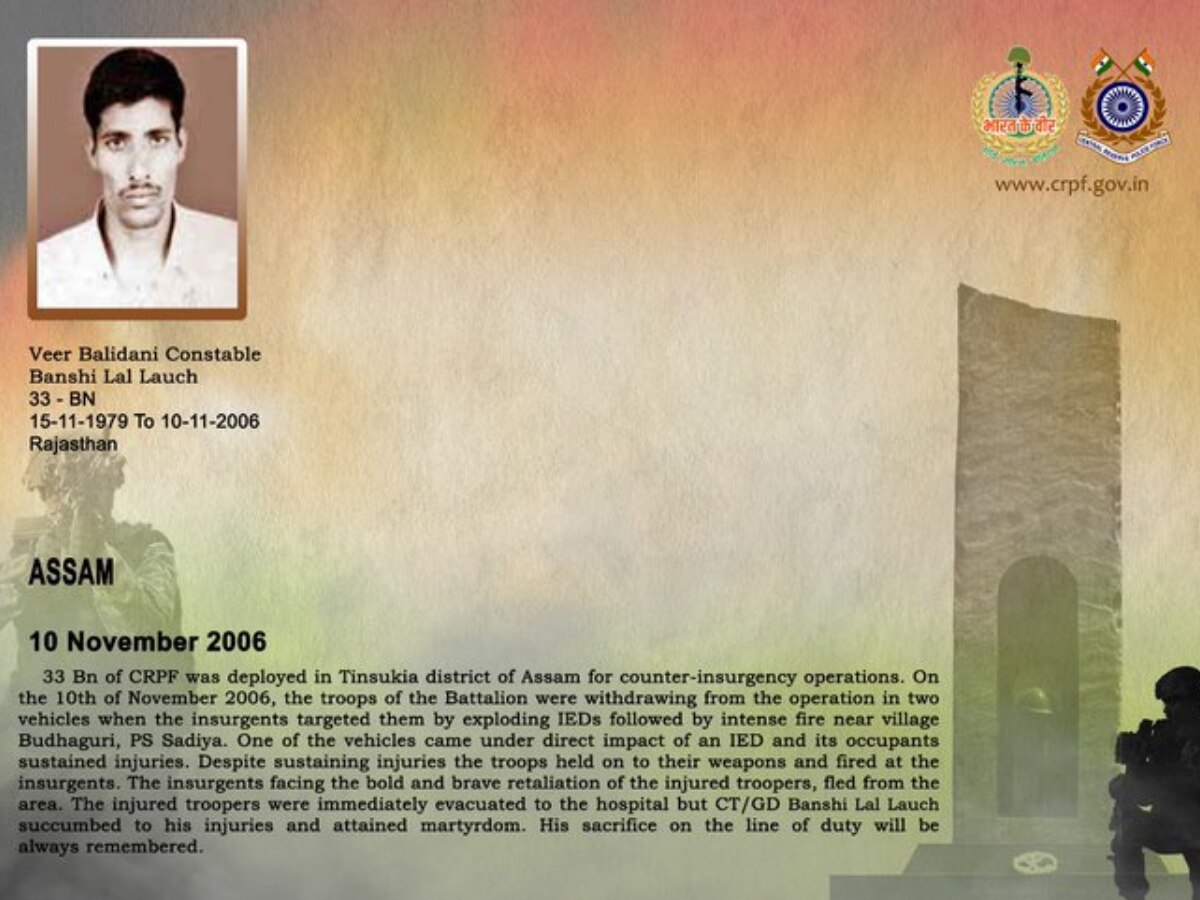 असम के तिनसुकिया जिले में 10 नवंबर 2006 को 33 बटालियन सीआरपीएफ के जवान एक ऑपरेशन से लौट रहे थे. तभी सादिया थाना क्षेत्र के बुधगुड़ी गांव के पास विद्रोहियों ने IED विस्फोट कर हमला किया. विस्फोट से एक वाहन सीधे तौर पर प्रभावित हुआ और उसमें सवार कांस्टेबल बंशी लाल लौच घायल हो गए. घायल होने पर भी उन्होंने साथी जवानों के साथ मिलकर विद्रोहियों को मुंहतोड़ जवाब दिया. घायलों को तुरंत अस्पताल ले जाया गया, लेकिन बंशी लाल लौच ने देश की सेवा में प्राण त्याग दिए थे. इस वीर बलिदानी को सीआरपीएफ बार-बार नमन करती है.