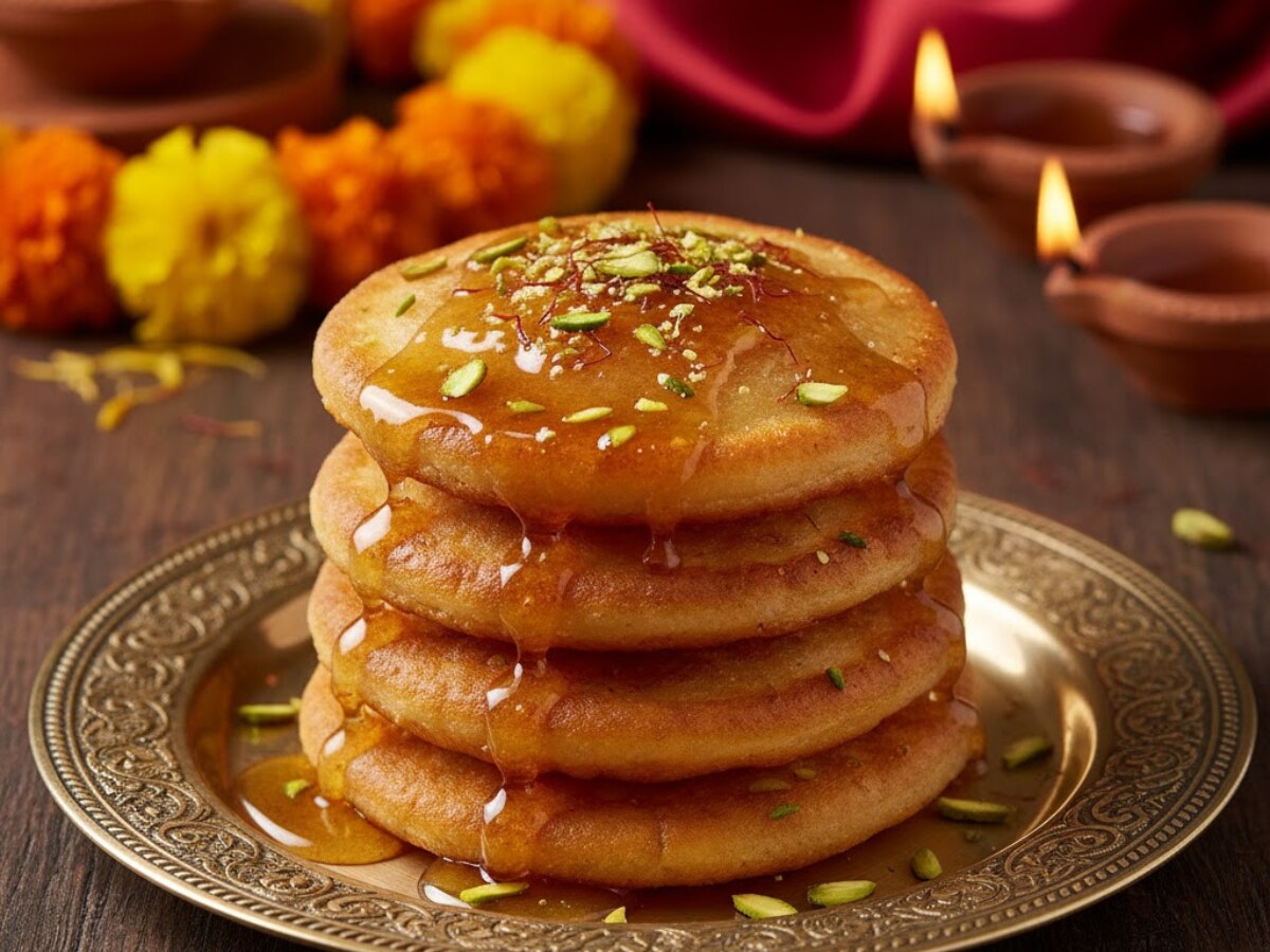मालपुआ एक पारंपरिक भारतीय मिठाई है जो दूध, मैदा और सूजी से बनाई जाती है. पैनकेक जैसे मैदे के फ्रिटर्स चाशनी में भीगे, केसर-बादाम टॉपिंग होती है. होली और तीज जैसे त्योहारों पर मालपुआ खास पसंद की जाती है.