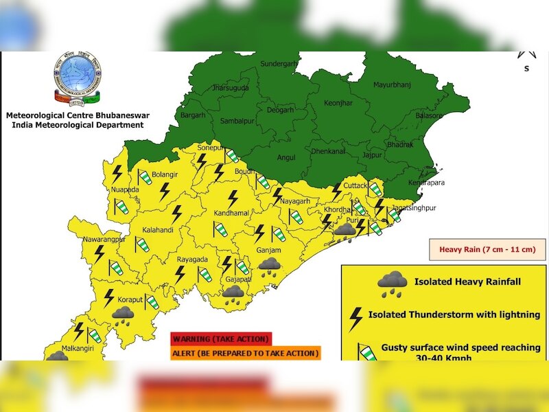 ଆଲର୍ଟ ଜାରି ହୋଇଥିବା ଜିଲ୍ଲାରେ ବିଜୁଳି ଘଡ଼ଘଡ଼ି ସହ ପ୍ରବଳ ବର୍ଷା ଓ ୪୦-୫୦ କିମି ବେଗରେ ପବନ ବହିବାର ସମ୍ଭାବନା ରହିଛି।