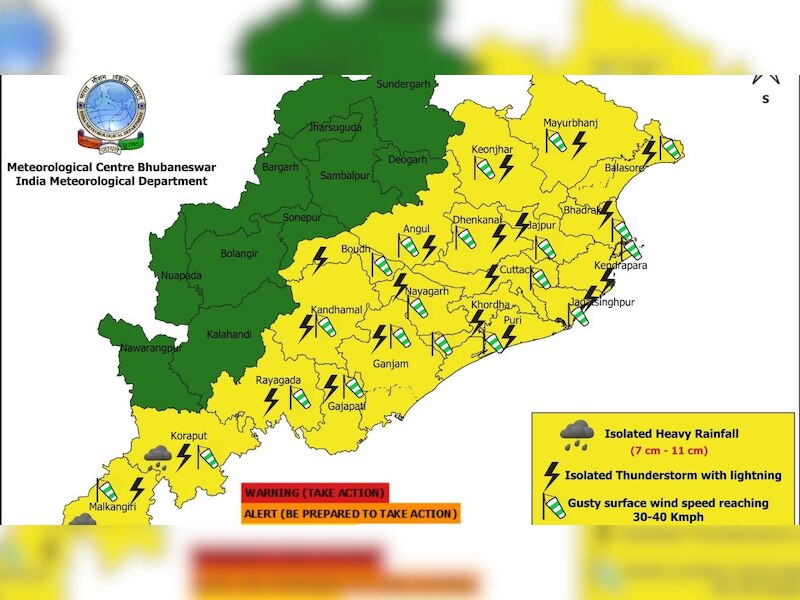 ଆଲର୍ଟ ଜାରି ହୋଇଥିବା ଜିଲ୍ଲାରେ ବିଜୁଳି ଘଡ଼ଘଡ଼ି ସହ ପ୍ରବଳ ବର୍ଷା ଓ ୪୦-୫୦ କିମି ବେଗରେ ପବନ ବହିବାର ସମ୍ଭାବନା ରହିଛି।