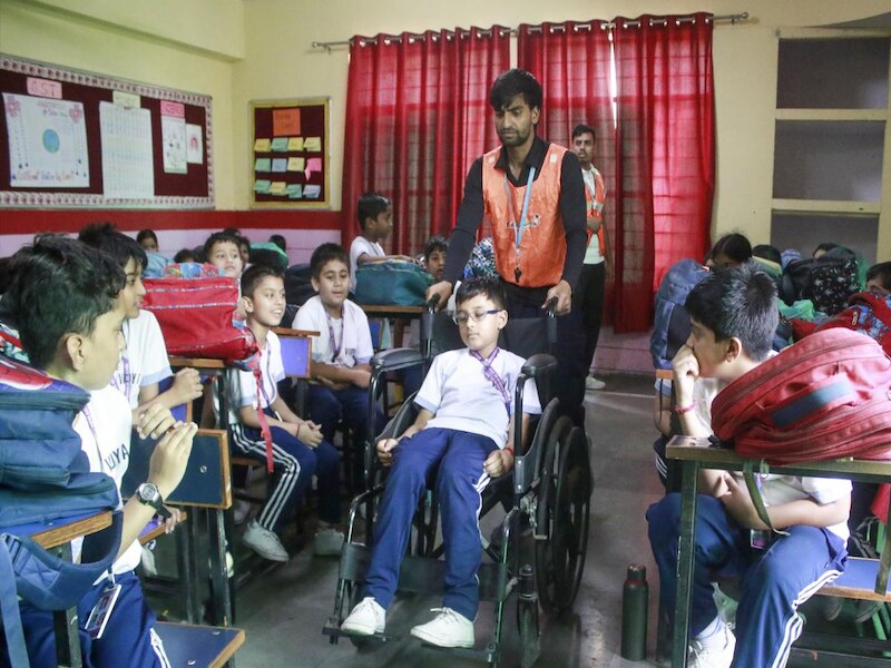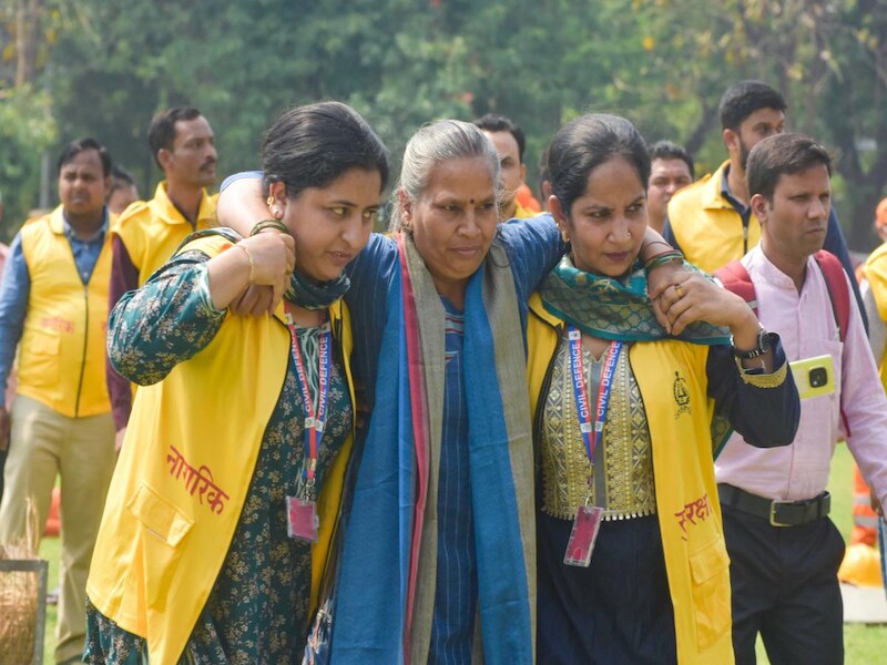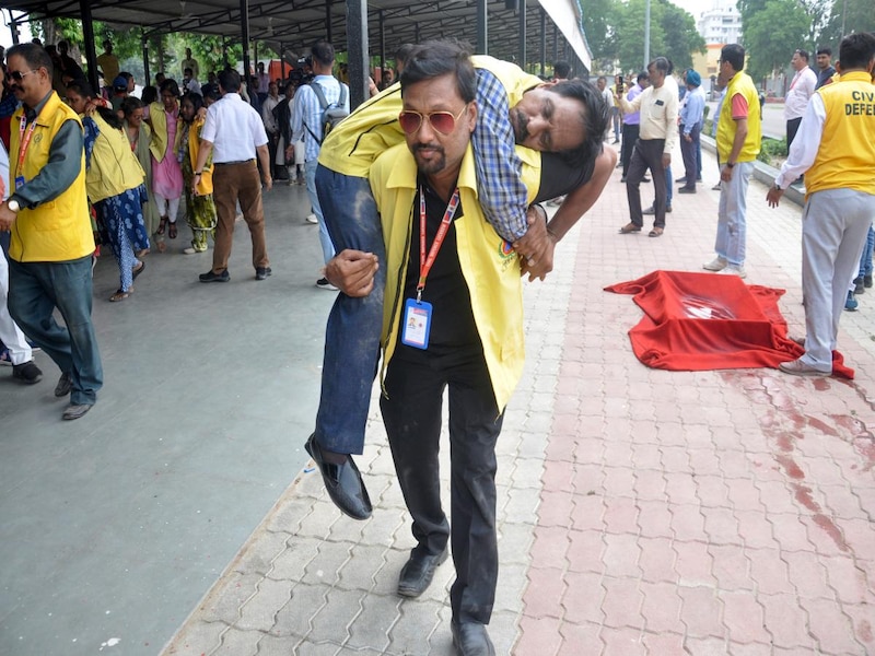 नई दिल्ली: दिल्ली में बुधवार को एक स्कूल में मॉक ड्रिल के दौरान एक स्टूडेंट को सहायता मुहैया कराते हुए सिविल डिफेंस का कर्मचारी.