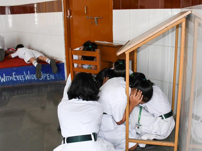 रांची: बुधवार, 07 मई, 2025 को रांची में राष्ट्रव्यापी मॉक ड्रिल के तहत एक स्कूल में नागरिक सुरक्षा मॉक ड्रिल के दौरान बेंचों के नीचे शरण लेते स्कूली छात्र.