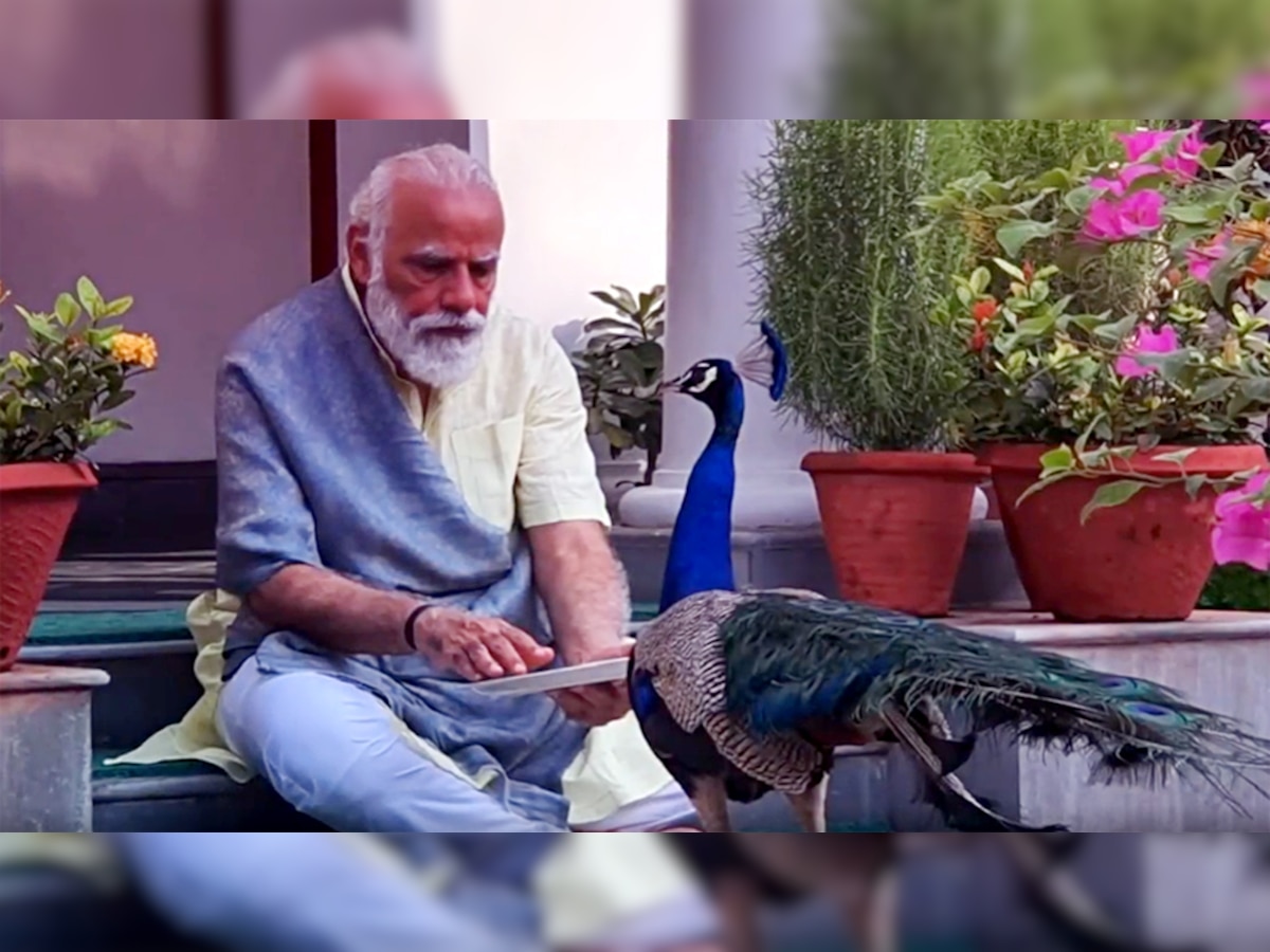 वीडिया में नज़र आ रहा है कि पीएम मोदी सुबह की सैर के दौरान मोर को दाना खिला रहे है. तस्वीरों में दिखने वाले मोर उनकी सुबह की सैर के दौरान साथी भी होते हैं.
