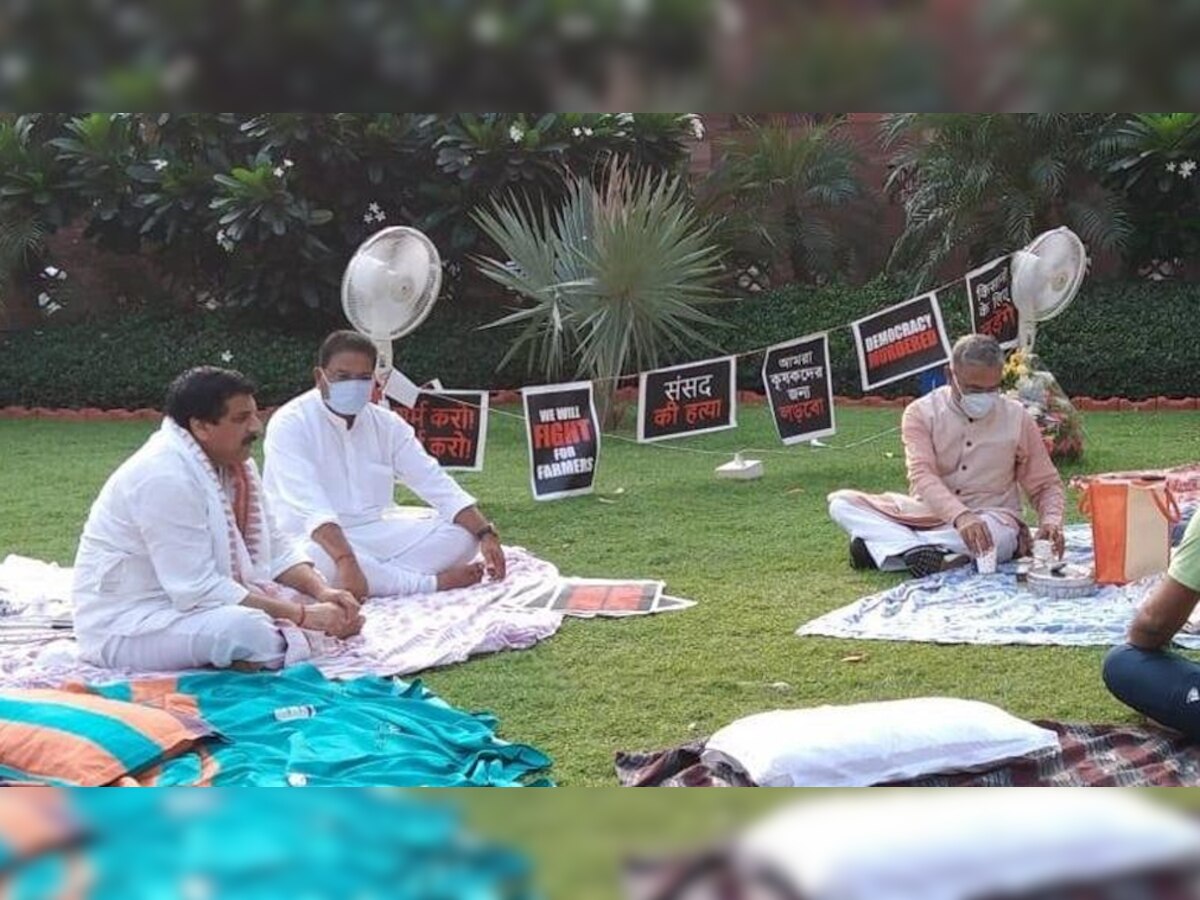 मुअत्तल किए गए एमपीज़ में आम आदमी पार्टी (AAP) के एमपी संजय सिंह ने ट्वीट करते हुए कहा हम लोग पूरी रात यहां घरने पर बैठे रहे मुल्क के करोड़ों किसानों के इंसाफ दिलाने के लिए, मुल्क के किसानों के खिलाफ जो काला कानून जो पार्लियामेंट के अंदर पास किया है उसके खिलाफ. आज सुबह यहां पर डिप्टी स्पीकर साहब आए थे, हमने उनसे भी कहा उस दिन नियम कानून का ताक पर रखकर किसान मुखालिफ बिल मुल्क पार्लियामेंट में पास किया गया जबिक भाजपा के पास अक्सरियत (बहुमत) नहीं थी. हम लोग वोटिंग मांगते रहे, आपने वोटिंग नहीं कराई, यह किसानों के साथ धोका हुआ है.