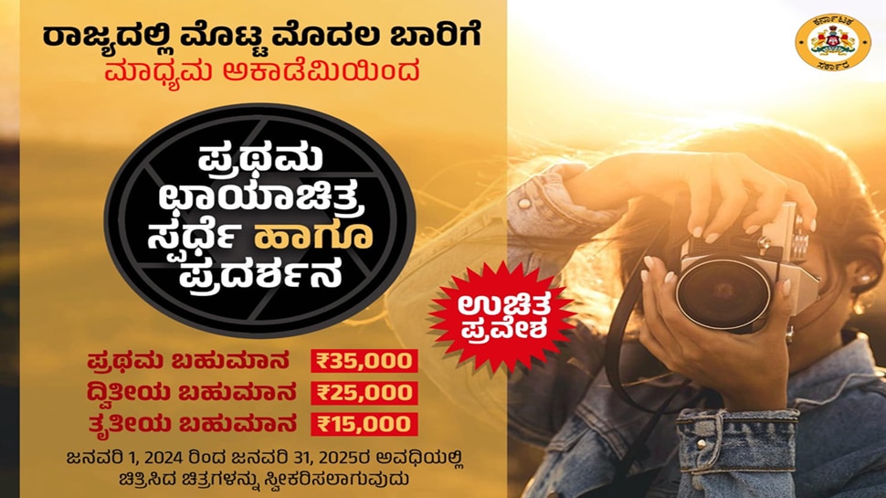 ಬೆಂಗಳೂರು : ಕರ್ನಾಟಕ ಮಾಧ್ಯಮ ಅಕಾಡೆಮಿಯು ರಾಜ್ಯದಲ್ಲಿ ಮೊಟ್ಟ ಮೊದಲ ಬಾರಿಗೆ ಕರ್ನಾಟಕದ ಸುದ್ದಿ ಛಾಯಾ ಚಿತ್ರಗ್ರಾಹಕರಿಗಾಗಿ ರಾಜ್ಯಮಟ್ಟದ ಛಾಯಾಚಿತ್ರ ಸ್ಪರ್ಧೆ ಹಾಗೂ ಪ್ರದರ್ಶನವನ್ನು ಏರ್ಪಡಿಸಿದೆ.