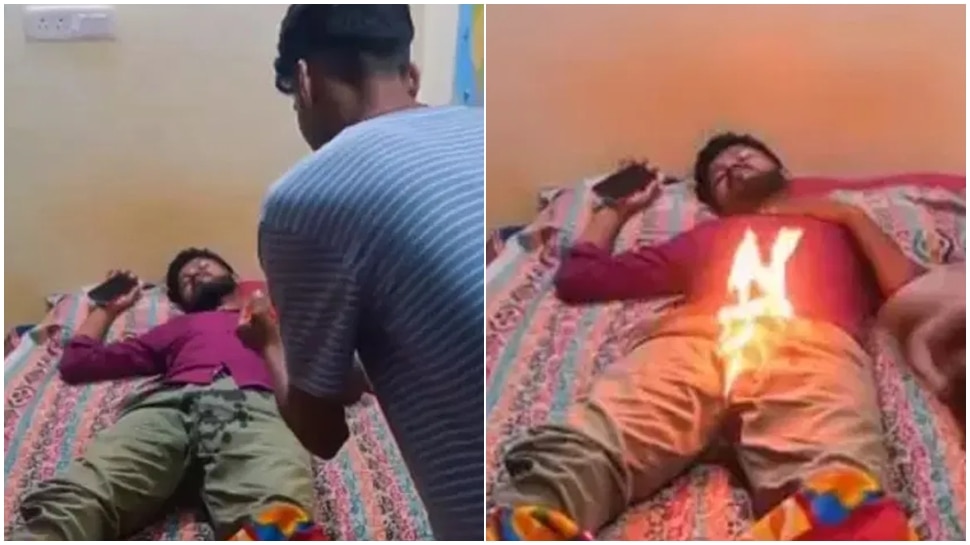 ಪ್ಯಾಂಟ್ಗೆ ಬೆಂಕಿ ಹತ್ತಿದ್ದನ್ನು ಗಮನಿಸಿದ ಯುವಕ ಏಕಾಏಕಿ ಎದ್ದು ಗಾಬರಿಯಾಗುತ್ತಾನೆ.... ತಕ್ಷಣ ಬೆಂಕಿ ನಂದಿಸಲು ಯತ್ನಿಸುತ್ತಾನೆ.... ಬಳಿಕ ಗೆಳೆಯರನ್ನು ಅಟ್ಟಾಡಿಸಿಕೊಂಡು ಥಳಿಸಲು ಓಡುತ್ತಾನೆ... ಆದರೆ ಸ್ವಲ್ಪ ಸಮಯ ಕಾದ ನಂತರ ಅವನ ಕೋಪ ಕಡಿಮೆಯಾಯಿತು.. ನಂತರ ಸ್ನೇಹಿತರ ಜೊತೆ ಎಂಜಾಯ್ ಮಾಡುತ್ತಾನೆ..