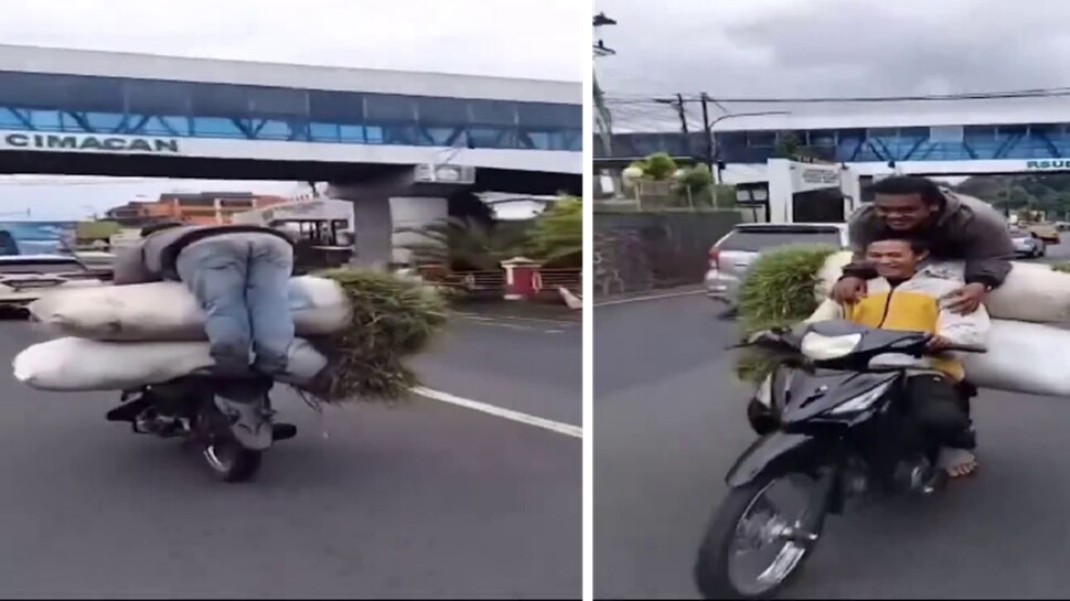 ಇದೀಗ ವೈರಲ್ ಆಗಿರೋ ವಿಡಿಯೋದಲ್ಲಿ ಯುವಕನೊಬ್ಬ ಸ್ಕೂಟರ್ನಲ್ಲಿ ತಮ್ಮ ಪ್ರಾಣಿಗಳಿಗೆ ಹುಲ್ಲು ತೆಗೆದುಕೊಂಡು ಹೋಗುತ್ತಿದ್ದಾನೆ. ಮುಂದೆ ಕುಳಿತುಕೊಂಡಿರುವ ಆತ ತನ್ನ ಹಿಂದೆ ಎರಡು ಹುಲ್ಲಿನ ಚೀಲಗಳನ್ನು ಇಟ್ಟುಕೊಂಡು ಸ್ಕೂಟರ್ ರೈಡ್ ಮಾಡುತ್ತಿರುತ್ತಾನೆ. ಹಿಂದೆ ಮತ್ತೊಬ್ಬರು ಕುಳಿತುಕೊಳ್ಳಲು ಸ್ವಲ್ಪವೂ ಜಾಗವಿಲ್ಲ. ಆದರೆ ಯುವಕನೊಬ್ಬ ಆ ಹುಲ್ಲಿನ ಚೀಲಗಳ ಮೇಲೆ ಮಲಗಿ ಸ್ಕೂಟರ್ ರೈಡ್ ಮಾಡುತ್ತಿರುವವನ ಭುಜವನ್ನು ಹಿಡಿದುಕೊಂಡು ಬ್ಯಾಲೆನ್ಸ್ ಮಾಡುತ್ತಾ ಹೋಗಿದ್ದಾನೆ. ಈ ರೀತಿ ಸ್ಕೂಟರ್ ಮೇಲೆ ಪ್ರಯಾಣಿಸುತ್ತಿರುವಾಗ ಕೊಂಚ ಎಚ್ಚರ ತಪ್ಪಿದರೂ ಇಬ್ಬರು ನೆಲಕ್ಕೆ ಬೀಳತ್ತಾರೆ.