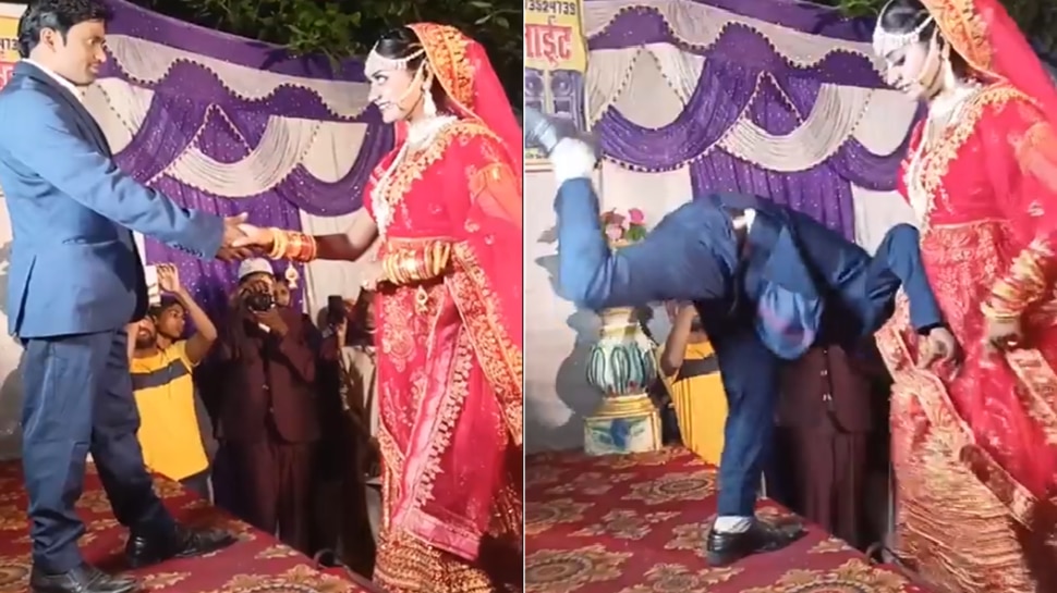 ವೈರಲ್ ವಿಡಿಯೋ ಪ್ರಕಾರ, ಮದುವೆ ಸಮಾರಂಭ ನಡೆಯುತ್ತಿದೆ. ಈ ವೇಳೆ ವರ ಕಾರ್ಯಕ್ರಮದ ವೇದಿಕೆಯಲ್ಲಿ ನಿಂತಿದ್ದನು. ವಧು ಆಗಷ್ಟೇ ಮೆಟ್ಟಿಲುಗಳನ್ನು ಏರಿ ಮೇಲೆ ಬರುತ್ತಿದ್ದಳು. ಈ ವೇಳೆ ವರ ಆಕೆಯ ಬಳಿ ಹೋಗಿ ಕೈ ಹಿಡಿಯುವಂತೆ ಮುಂದೆ ಬಂದಿದ್ದಾನೆ. ಆದರೆ ವಧು ವರನ ಕೈ ಹಿಡಿದು ಬಲವಾಗಿ ಎಳೆದು ಕೆಳಗೆ ಬೀಳಿಸಿದ್ದಾಳೆ. ವಧು ವೇದಿಕೆ ಮೇಲೆ ಹೋಗಿ ನಕ್ಕರೆ ಕೆಳಗೆ ಬಿದ್ದ ವರ ಪೆಚ್ಚಾಗಿ ಸಪ್ಪೆ ಮೋರೆ ಹಾಕಿದ್ದಾನೆ.