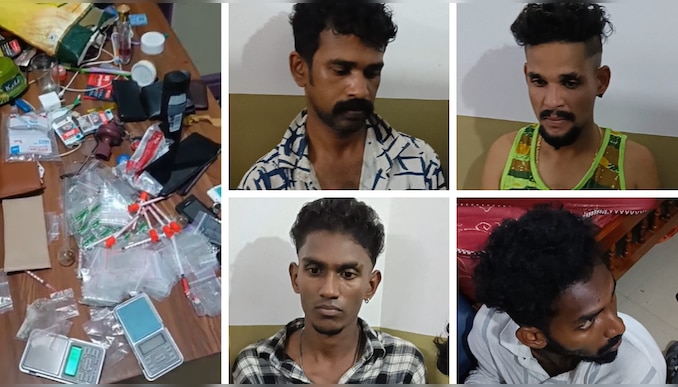 പത്തനാപുരം സ്വകാര്യ ലോഡ്ജിൽ താമസിച്ചു ലഹരി പാർട്ടി നടത്തി വന്ന തിരുവനന്തപുരം കഠിനംകുളം സ്വദേശി വിപിൻ, മണക്കാട് സ്വദേശി വിവേക്, പേയാട് സ്വദേശി കിരൺ, കണ്ണമ്മൂല സ്വദേശി ടെർബിൻ എന്നിവരാണ് പിടിയിലായത്. കിരണിന് കുഞ്ഞ് ജനിച്ചതിന്റെ ലഹരി പാർട്ടിയാണ് നടത്തിയത്. 460 മില്ലിഗ്രാം എംഡിഎംഎ, 22 ഗ്രാം കഞ്ചാവ്, 10 സിറിഞ്ചുകൾ, ഡിജിറ്റൽ ത്രാസ് എന്നിവയും ഇവരുടെ പക്കൽ നിന്നും കണ്ടെടുത്തു.