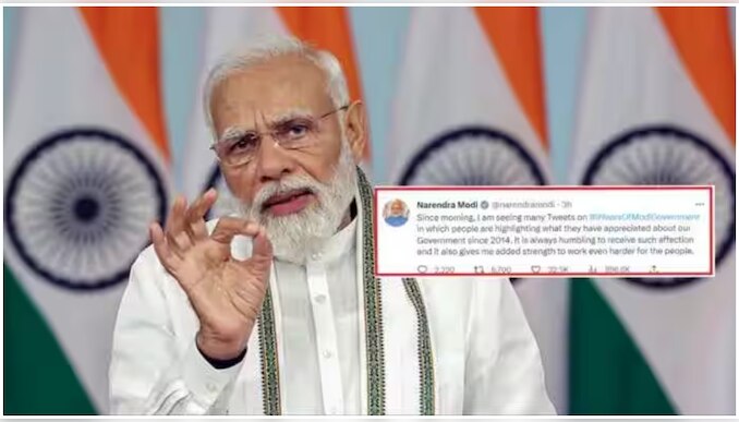 "#9YearsOfModiGovernment എന്ന ഹാഷ്ടാഗിൽ നിരവധി ട്വീറ്റുകളാണ് ഞാൻ കാണുന്നത്. അതിൽ 2014 മുതലുള്ള നമ്മുടെ സർക്കാരിനെക്കുറിച്ച് അവർ അഭിനന്ദിച്ച കാര്യങ്ങളാണ് ഉയത്തിക്കാട്ടുന്നത്. അത്തരം സ്നേഹ വാത്സല്യങ്ങൾ ലഭിക്കുന്നത് വിനയത്തോടെ സ്വീകരിക്കുന്നു. മാത്രമല്ല, ഇത് ജനങ്ങൾക്ക് വേണ്ടി കൂടുതൽ കഠിനാധ്വാനം ചെയ്യാനുള്ള ശക്തിയും നൽകുന്നു." പ്രധാനമന്ത്രി ട്വിറ്ററിൽ കുറിച്ചു.