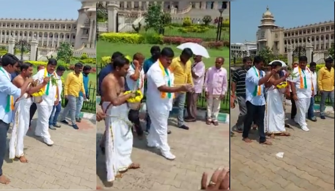 #WATCH | Bengaluru: Congress workers sprinkle cow urine and perform Pooja at the State Assembly in Bengaluru. They said that they are 'purifying' Vidhana Soudha. pic.twitter.com/SWapoH7vOL