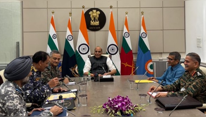 Delhi | Defence Minister Rajnath Singh reviewing situation at South Block with CDS Gen Anil Chauhan, Navy chief Admiral Dinesh K Tripathi, Army Chief Gen Upendra Dwivedi, Air Chief Air Chief Marshal AP Singh & Defence Secretary RK Singh