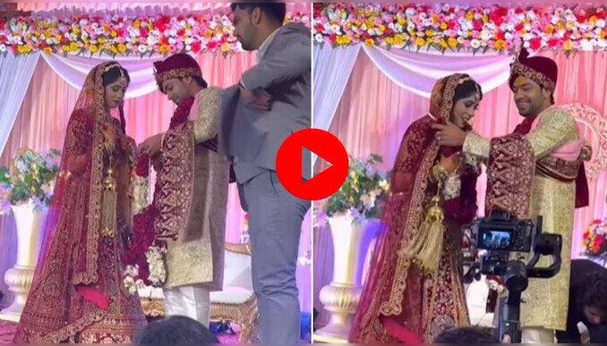 മാല പോയിരിക്കുന്നത് കണ്ട വരൻ ആദ്യം ഒന്ന് പുഞ്ചിരിച്ചു ശേഷം മലയുടെ രണ്ടറ്റവും ചേർത്തു പിടിച്ചു കെട്ടുന്നതും നിങ്ങൾക്ക് വീഡിയോയിൽ കാണാൻ കഴിയും. ഇത് കണ്ട വധുവിന്റെ ഹൃദയം നിറഞ്ഞു. ശേഷം വരൻ വധുവിനെ വരമാല അണിയിച്ചു. വീഡിയോ കാണാം...