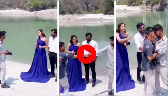 സോഷ്യൽ മീഡിയയിൽ വൈറലാകുന്ന ഈ വീഡിയോയിൽ നിങ്ങൾക്ക് കാണാൻ കഴിയും വധൂവരന്മാർ നദിയുടെ തീരത്തെ മനോഹരമായ ഒരു സ്ഥലത്ത് ഫോട്ടോഷൂട്ടിനോ വീഡിയോ ഷൂട്ടിനോ വേണ്ടി ക്യാമറാമാനുമായി വന്നു നിൽക്കുന്നത്. വധു നീല ഗൗണിലും വരൻ കറുത്ത പാന്റും വെള്ള ഷർട്ടുമാണ് ധരിച്ചിരിക്കുന്നത്. ഇരുവരുടെയും അടുത്ത് രണ്ട് ക്യാമറാമാൻമാരെയും കാണാം. എന്ത് രംഗമാണ് ഷൂട്ട് ചെയ്യേണ്ടതെന്ന് ക്യാമറാമാന്മാർ കാണിച്ചു കൊടുക്കുന്നതാണ് അടുത്ത രംഗം. എന്നാൽ അതുകണ്ട വധൂവരന്മാർ ശരിക്കും ഞെട്ടിപ്പോയി. വീഡിയോ കാണാം...