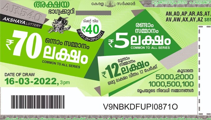 Akshaya lottery AK 644 results 24-03-2024: സംസ്ഥാന ലോട്ടറി വകുപ്പിൻറെ എഴ് ദിവസ ലോട്ടറികളിലൊന്നായ അക്ഷയ AK.644-ൻ്റെ നറുക്കെടുപ്പ് 2024 മാർച്ച് 24-ന് തിരുവനന്തപുരം ബേക്കറി ജംഗ്ഷന് സമീപമുള്ള ഗോർക്കി ഭവനിൽ വെച്ച് നടക്കും. എല്ലാ ഞായറാഴ്ചയും ഉച്ചകഴിഞ്ഞ് 3 മണിക്കാണ് ലോട്ടറിയുടെ നറുക്കെടുപ്പ്. ഓരോ ലോട്ടറിയെയും അക്ഷരമാലാ ക്രമത്തിൽ പ്രതിനിധീകരിക്കുന്നു, അക്ഷയ ലോട്ടറി കോഡ് "എകെ" ആണ്. 70 ലക്ഷമാണ് ഇതിൻറെ ഒന്നാം സമ്മാനം. കൂടാതെ നിരവധി സമ്മാനങ്ങൾ വേറെയും ഇതിനുണ്ട്.