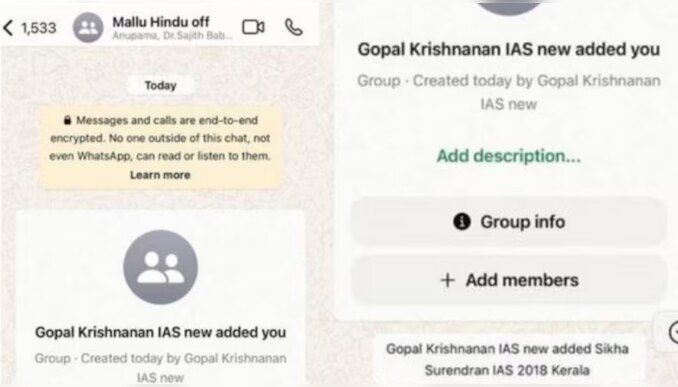 കുറച്ച് ദിവസം മുമ്പാണ് മല്ലു ഹിന്ദു ഓഫീസേഴ്സ് എന്ന പേരിൽ ഗോപാലകൃഷ്ണൻ അഡ്മിനായി ഗ്രൂപ്പ് രൂപം കൊണ്ടത്. സർവ്വീസിലെ മുതിർന്ന ഉദ്യോഗസ്ഥരെ അടക്കം ഗ്രൂപ്പിൽ ചേർത്തിരുന്നു. ഇത്തരമൊരു ഗ്രൂപ്പിനെക്കുറിച്ച് ചിലർ ആശങ്ക അറിയിച്ചു. പിന്നാലെ ഗ്രൂപ്പ് ഡിലീറ്റ് ചെയ്ത് ഫോൺ ഹാക്ക് ചെയ്തതായി അദ്ദേഹം പ്രതികരിച്ചിരുന്നു. തുടർന്ന് അദ്ദേഹം സിറ്റി സൈബർ സെല്ലിൽ പരാതി നൽകി.