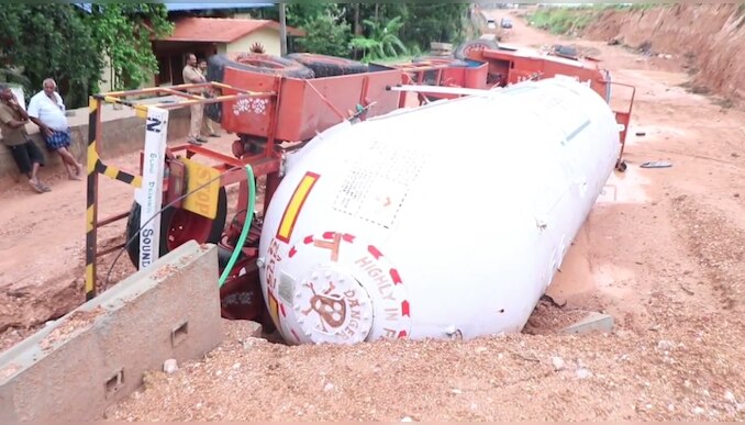 ഇന്ന് വെളുപ്പിന് 4 മണിയോടെയാണ് അപകടം ഉണ്ടായത്. ദേശീയപാത നിർമ്മാണം നടക്കുന്നതിനാൽ വഴിതെറ്റി സർവ്വീസ് റോഡു വഴി വന്ന ടാങ്കറാണ് മറിഞ്ഞത്. കൊച്ചിയിൽ നിന്ന് തിരുനെൽവേലിയിലേക്ക് പാചകവാതകവുമായി പോവുകയായിരുന്നു. ശക്തമായ മഴയായതിനാൽ മണ്ണിൽ താഴ്ന്ന ടാങ്കർ മറിയുകയായിരുന്നു. വാതകചോർച്ച ഇല്ലാത്തതിനാൽ ഡ്രൈവർ പോലീസിൽ വിവരമറിയിച്ചില്ല. ഏഴരയോടെയാണ് പോലീസ് വിവരമറിഞ്ഞത്. പിന്നാലെ തന്നെ മംഗലപുരം പോലീസും കഴക്കൂട്ടം ഫയർ ഫോഴ്സും സ്ഥലത്തെത്തി.ഡ്രൈവർ നാമക്കൽ സ്വദേശി എറ്റിക്കൺ (65) പരിക്കുകളില്ലാതെ രക്ഷപ്പെട്ടു.