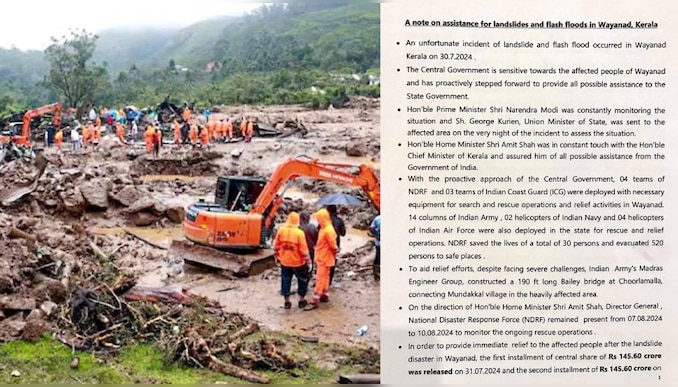 പ്രധാനമന്ത്രി ആവശ്യപ്പെട്ടിട്ടും മൂന്നരമാസം വൈകിപ്പിച്ചു. ദുരന്ത സമയത്ത് കേരളത്തിന് എല്ലാ സഹായവും നൽകി. നിരന്തരം മുഖ്യമന്ത്രിയുമായി സംസാരിക്കുകയും സേനകളെ നൽകുകയും ചെയ്തു. നിവേദനം സെക്രട്ടറിമാരുടെ സമിതി പരിശോധിക്കുകയാണെന്നും കുറിപ്പിൽ പറയുന്നു. കേരളത്തിന് ഉചിതമായ സഹായം നൽകുമെന്നും കുറിപ്പിൽ വ്യക്തമാക്കി.