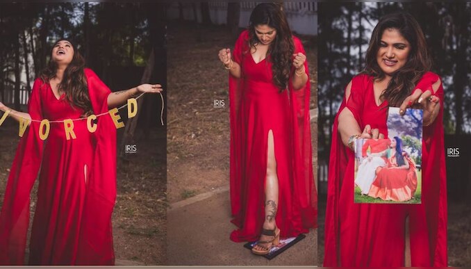 ശബ്ദമില്ലാത്തവരായി തോന്നുന്നവർക്കായി വിവാഹമോചനം നേടിയ ഒരു സ്ത്രീയുടെ സന്ദേശം എന്ന കുറിപ്പോടെയാണ് താരം തന്റെ ഇൻസ്റ്റയിലൂടെ ഈ ചിത്രങ്ങൾ പങ്കുവെച്ചിരിക്കുന്നത്. ഇന്ത്യയിലെ ആദ്യ ഡിവോഴ്സ് ഫോട്ടോഷൂട്ടെന്നും താരം അവകാശപ്പെടുന്നുണ്ട്.