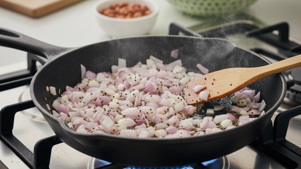 ഒരു പാനിൽ എണ്ണ ചൂടാക്കി അതിലേക്ക് അൽപം കടുകും, ജീരകവും ചേർക്കുക. കടുക് പൊട്ടിയ ശേഷം ഉള്ളി അരിഞ്ഞത് ചേർത്ത് മൂപ്പിക്കുക.