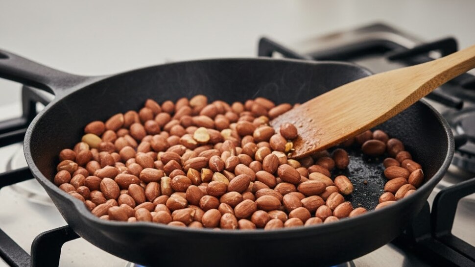 2 ടേബിൾസ്പൂൺ നിലക്കടല പാനിൽ വറുത്ത് എടുക്കുക. ശേഷം മാറ്റി വെക്കുക.