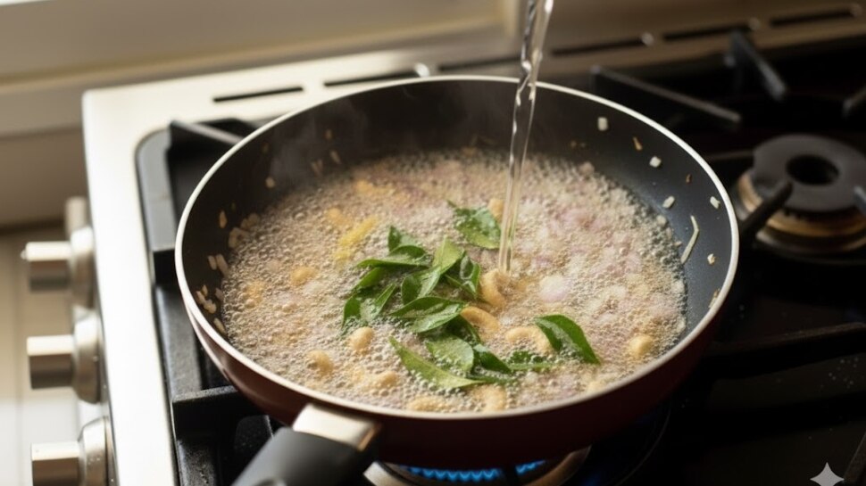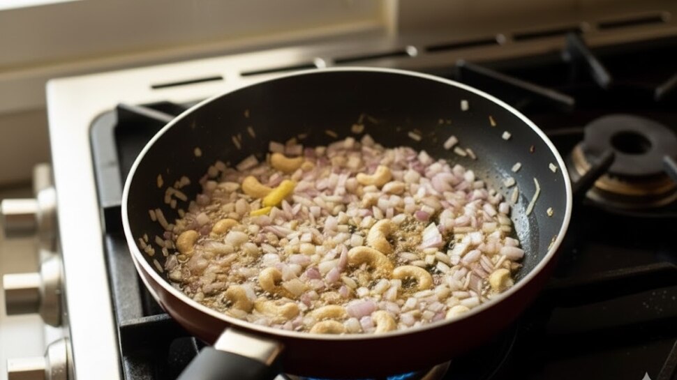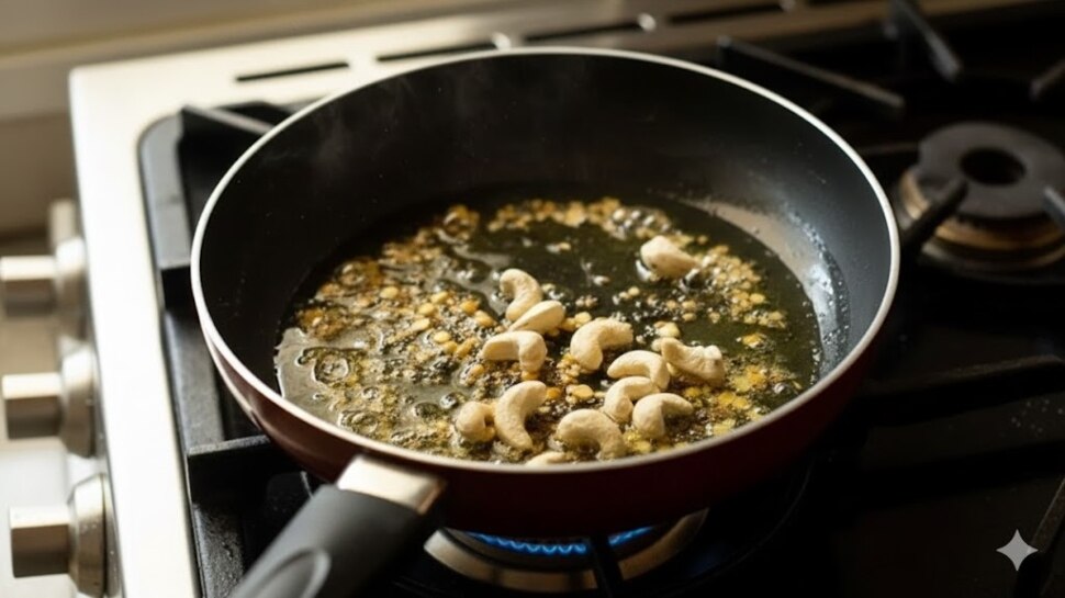 ഒരു പാനിൽ അൽപം എണ്ണയോ, നെയ്യോ ഒഴിക്കു. ഇതിലേക്ക് അൽപം കടുകും, പരിപ്പും, ജീരകവും, കശുവണ്ടിയും ചേർത്ത് ഇളക്കുക.