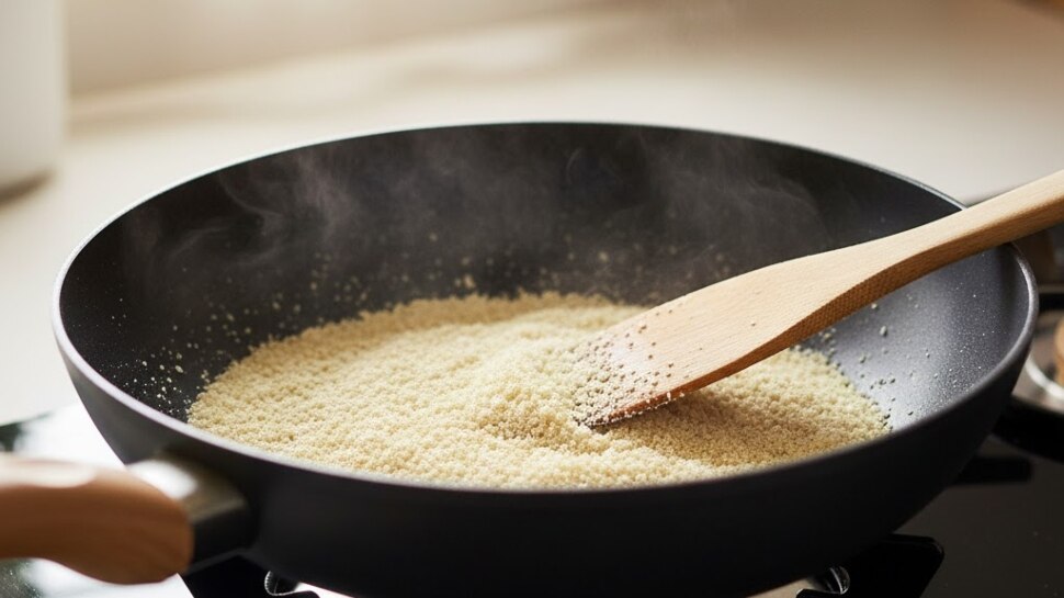 ഒരു നോൺസ്റ്റിക്ക് പാനിൽ 1 കപ്പ് റവ വറുക്കുക. സ്വർണ്ണ നിറമാകുമ്പോൾ മാറ്റിവെക്കാം.