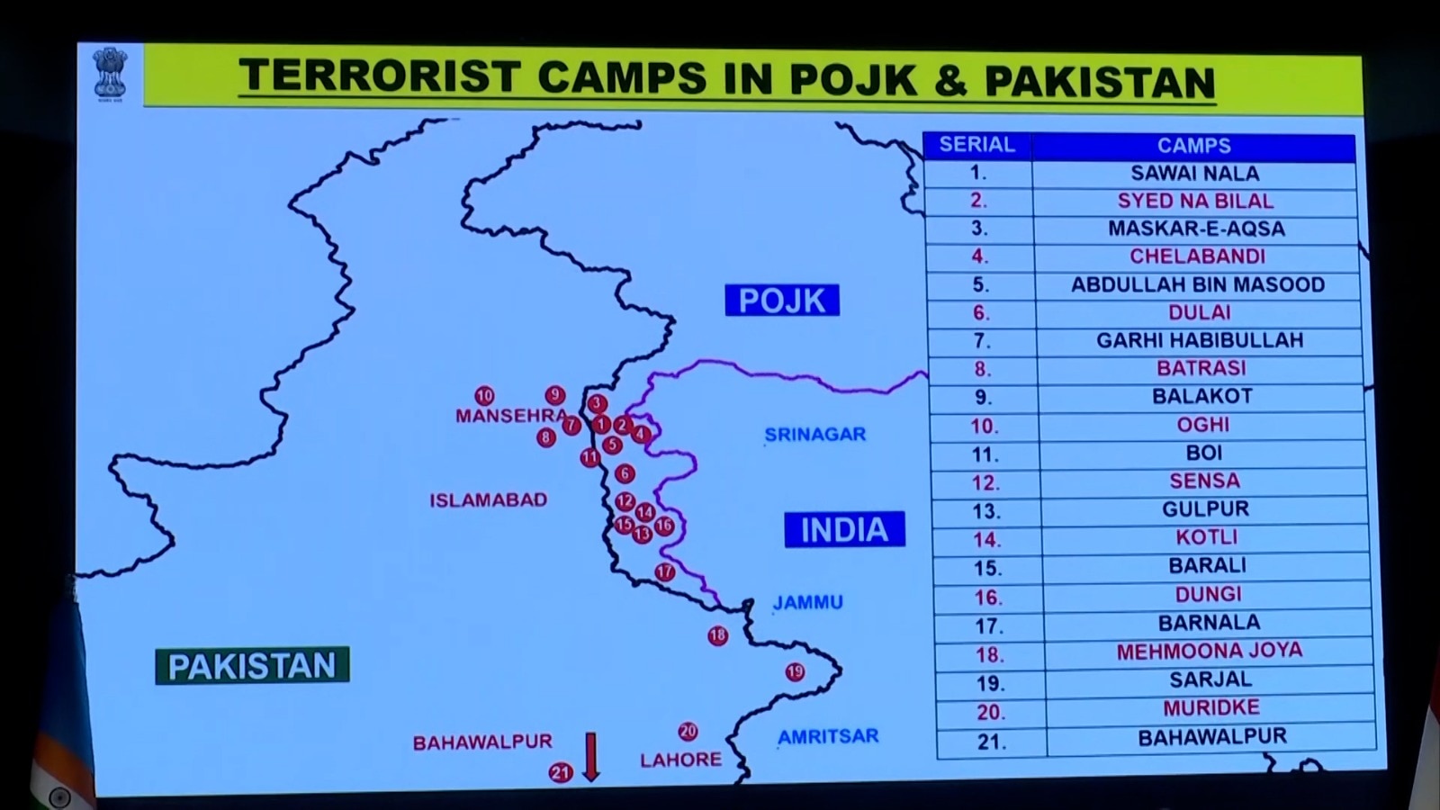 സർജാൽ/തെഹ്റ കലാൻ - പാക് പഞ്ചാബിലെ നരോവാല് ജില്ലയില്ലുള്ള സർജാൽ എന്ന ഭീകര കേന്ദ്രവും ഇന്ത്യൻ ആക്രമണത്തിൽ തകർന്ന് തരിപ്പണമായി. ജയ്ഷെ മുഹമ്മദ് ഭീകര സംഘടനയാണ് ഈ താവളം സ്ഥാപിച്ചത്. ജമ്മു കശ്മീരിലേക്ക് പാക് തീവ്രവാദികളെ നുഴഞ്ഞുകയറ്റാനായി സ്ഥാപിച്ചതാണിത്. ഡ്രോൺ ആക്രമണം നടത്താൻ ഉപയോഗിക്കുന്ന ലോഞ്ചിംഗ് ഇടവുമാണിത്. തെഹ്റ കലാൻ ഗ്രാമത്തിലെ ഒരു പ്രാഥമികാരോഗ്യ കേന്ദ്രത്തിന്റെ മറവിലാണ് ഈ കേന്ദ്രം പ്രവർത്തിച്ചിരുന്നത്. ജമ്മുവിലെ സാംബ സെക്ടറിന് വളരെ അടുത്താണിത്. ഇന്ത്യന് സേനയുടെ കണ്ണിലെ കരടായിരുന്നു സർജാൽ.