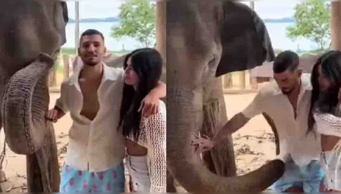കുട്ടിയാനയ്ക്കൊപ്പം ഒരു യുവാവും യുവതിയും ഫോട്ടോ എടുക്കാൻ നിൽക്കുന്നതാണ് വീഡിയോ. ഈ സമയം ആന തുമ്പി കൈ ഉയർത്തി നിൽക്കുകയായിരുന്നു. തുടർന്ന് കുട്ടിയാന യുവാവിന്റെ തുമ്പിക്കൈ കൊണ്ട് ഒരിടത്ത് തൊടുന്നതാണ് വീഡിയോ. ഈ സമയം യുവാവും യുവതിയും ഭയന്ന് ആനയുടെ പക്കൽ നിന്നും ഓടി മാറി. ഈ സമയം മറ്റുള്ളവർ ചിരിക്കുന്നത് വീഡിയോയിൽ കാണാൻ സാധിക്കും. വീഡിയോ കാണാം: