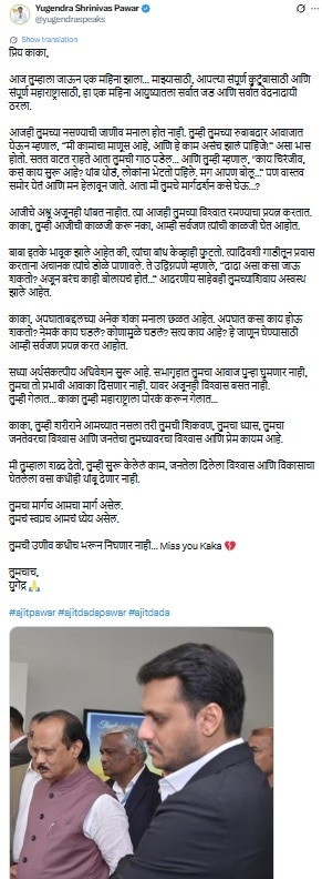 Ajit Pawar Death One Month Home Condition: राज्याचे उपमुख्यमंत्री अजित पवारांच्या निधानाला आज एक महिना झाला. आजच्याच दिवशी जानेवारी महिन्यात, बारामती विमानतळाजवळ झालेल्या अपघातामध्ये अजित पवारांसहीत पाच जणांचा मृत्यू झाला. अजित पवारांच्या विमान अपघातासंदर्भात शंका उपस्थित केली जात आहे. अजित पवारांच्या पक्षाचे आमदार अमोल मिटकरींनी अपघातानंतर पुढील काही दिवसांमध्येच या अपघातासंदर्भात शंका उपस्थित केली. अजित पवारांचे पुतणे आणि कर्जत-जामखेडचे आमदार रोहित पवारांनीही अनेकदा पत्रकारपरिषदा घेऊन या विमान अपघाताबद्दल शंका उपस्थित केली आहे. अशातच आज या अपघाताला एक महिना पूर्ण झाल्याच्या पार्श्वभूमीवर पवार कुटुंबाची काय स्थिती आहे याबद्दल अजित पवारांचे पुतणे युगेंद्र पवार यांनी लिहिलेल्या विशेष पोस्टमध्ये नमूद केली आहे.