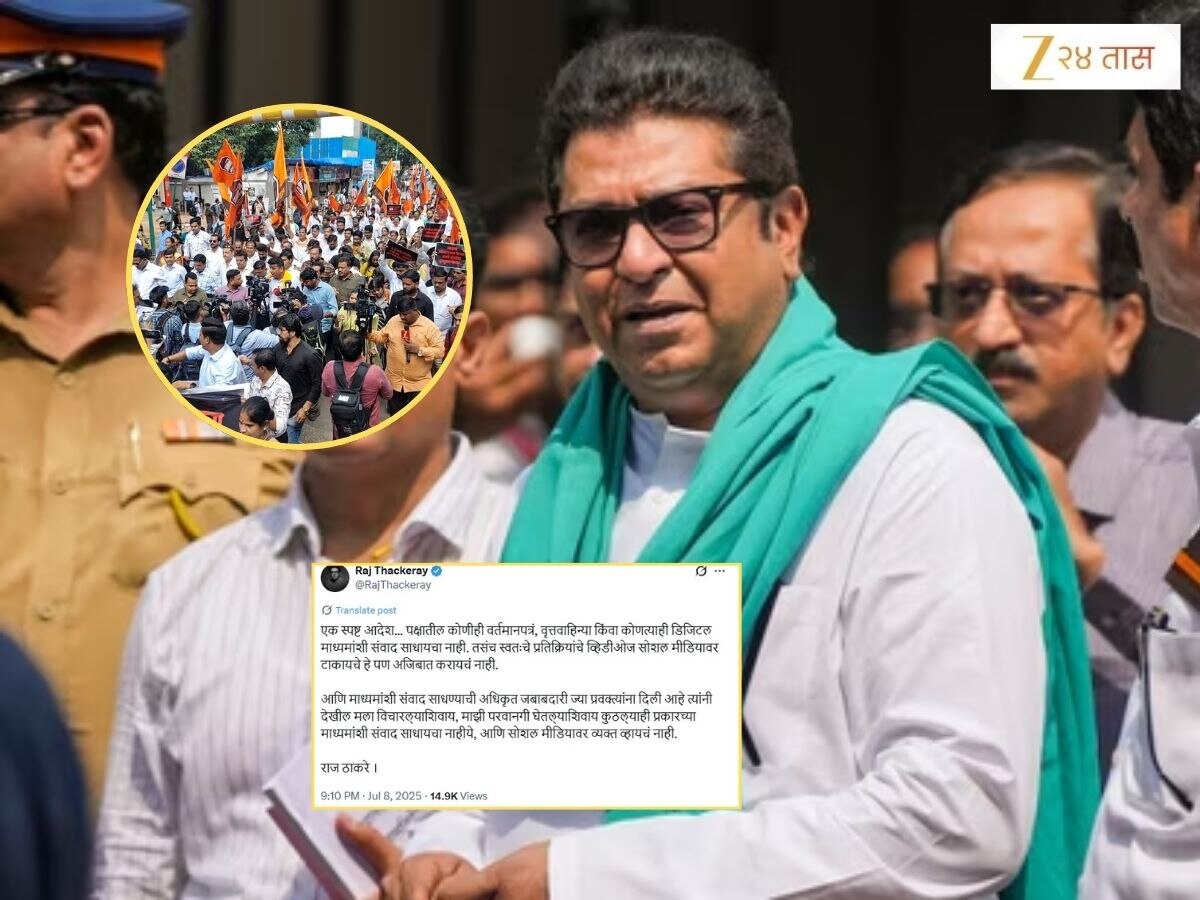 Raj Thackeray Post: मिरा रोड येथे मराठीच्या अस्मितेसाठी एल्गार पुकारण्यात आला. कोणताही झेंडा नाही फक्त मराठीचा अजेंडा म्हणत हजारो मराठी लोक मोर्चासाठी एकवटले. यामध्ये मनसे नेते आणि ठाकरेंच्या शिवसेनेच्या नेत्यांनी देखील सहभाग घेतला. या मोर्चातून मराठीचा अपमान करणा-यांना इशारा देण्यात आला आहे. दरम्यान या मोर्चानंतर मनसे अध्यक्ष राज ठाकरे यांनी सोशल मीडियावर पोस्ट शेअर करत पक्षातील नेते, कार्यकर्त्यांना आदेश दिला आहे. माझी परवानगी घेतल्याशिवाय कुठल्याही प्रकारच्या माध्यमांशी संवाद साधायचा नाहीये, आणि सोशल मीडियावर व्यक्त व्हायचं नाही असं राज ठाकरेंनी सांगितलं आहे.