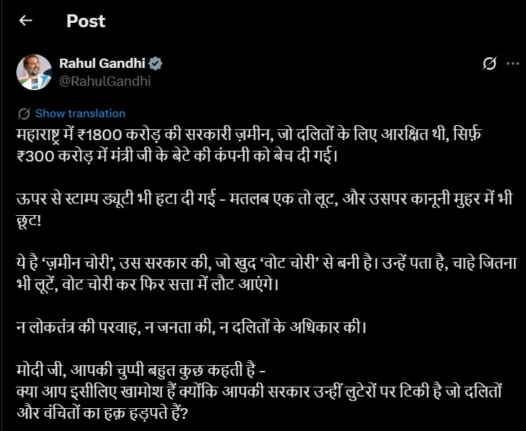 राहुल गांधी यांनी ट्विटमध्ये म्हटलं आहे की, महाराष्ट्रात 1800 कोटींची सरकारी जमीन जी दलितांसाठी आरक्षित होती. ती फक्त 300 कोटींना मंत्र्याच्या मुलाच्या कंपनीसाठी विकण्यात आली. इतकंच नव्हे तर स्टॅम्प ड्युटीदेखील हटवण्यात आली. एकीकडे लूट आणि त्यावर कायदेशीर सूटही देण्यात आली.