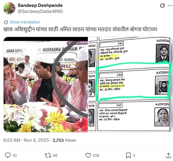 दुसरीकडे मनसेचे नेते संदीप देशपांडेंनी व्होट जिहादचा आरोप करणाऱ्या आशिष शेलारांचा एक जुना फोटो शेअर केला आहे. या फोटोमध्ये आशिष शेलार हे मुस्लिम बांधवांच्या एका कार्यक्रमात सहभागी झाल्याचं दिसत असून सोबत विद्यमान मुख्यमंत्री देवेंद्र फडणवीसही दिसत आहेत. "खास अशिशुद्दीन यांच्यासाठी अमित साठम यांच्या मतदार संघातील बोगस घोटाळा," असं म्हटलं आहे. सोबत देशपांडेंनी अमित साटम यांच्या मतदारसंघातील बोगस मतदारांची यादी जोडली आहे.