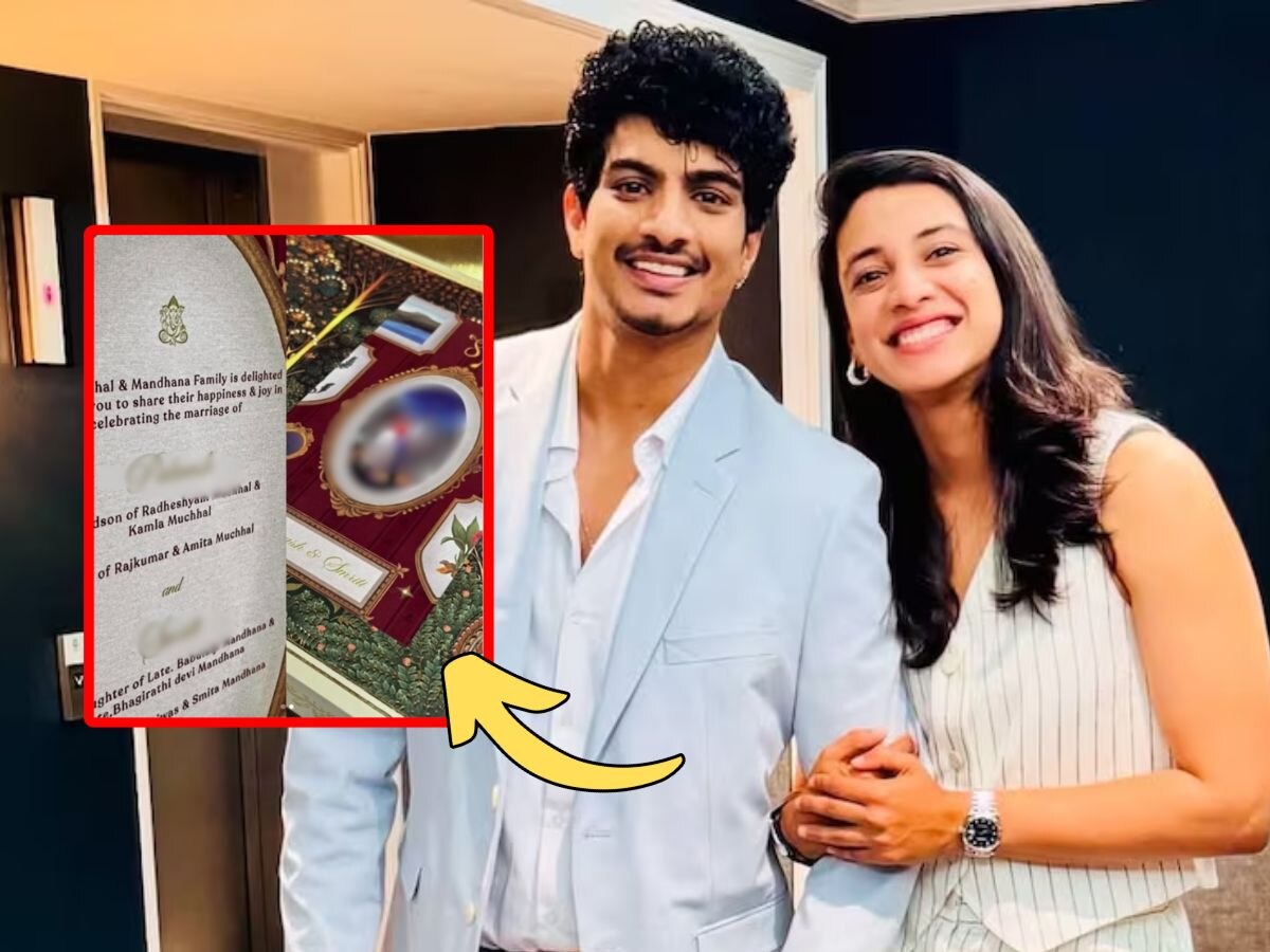 स्मृती मंधाना आणि पलाश मुच्छल या दोघांची लग्नपत्रिका सोशल मीडियावर व्हायरल झाली आहे. ही पत्रिका खूपच रॉयल आहे. पत्रिकेच्या वरच्या भागात स्मृती आणि पलाश यांचा क्रिएटिव्ह फोटो आहे. यात स्मृतीच्या हातात बॅट तर पलाशच्या हातात गिटार दिसतेय.