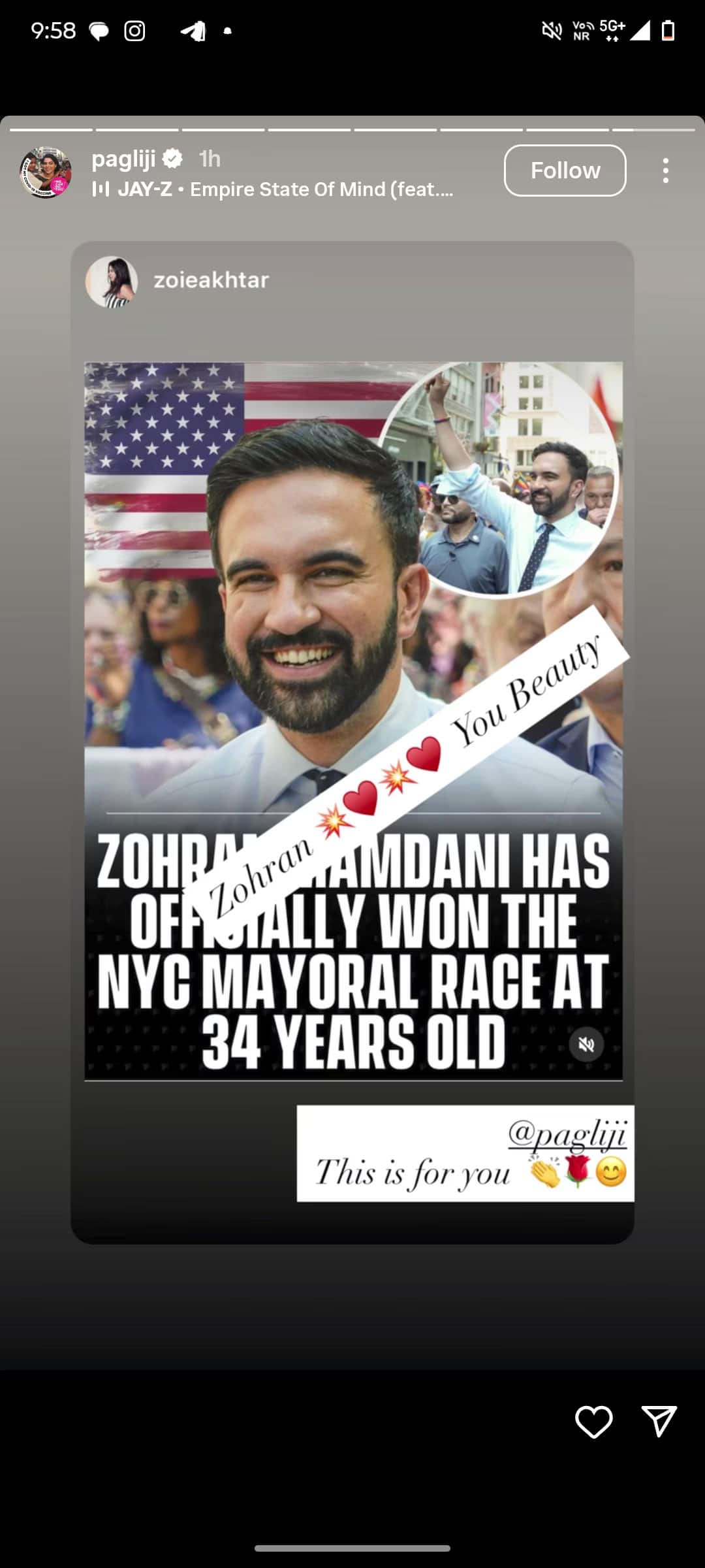 As Mamdani won the NYC mayoral election, a proud mom Mira Naira shared a story by Indian film director Zoya Akhtar with the words: "Zohran, you beauty." The story was accompanied by Jay-Z's iconic track, 'Empire State Of Mind.' Here's Nair's Instagram post: