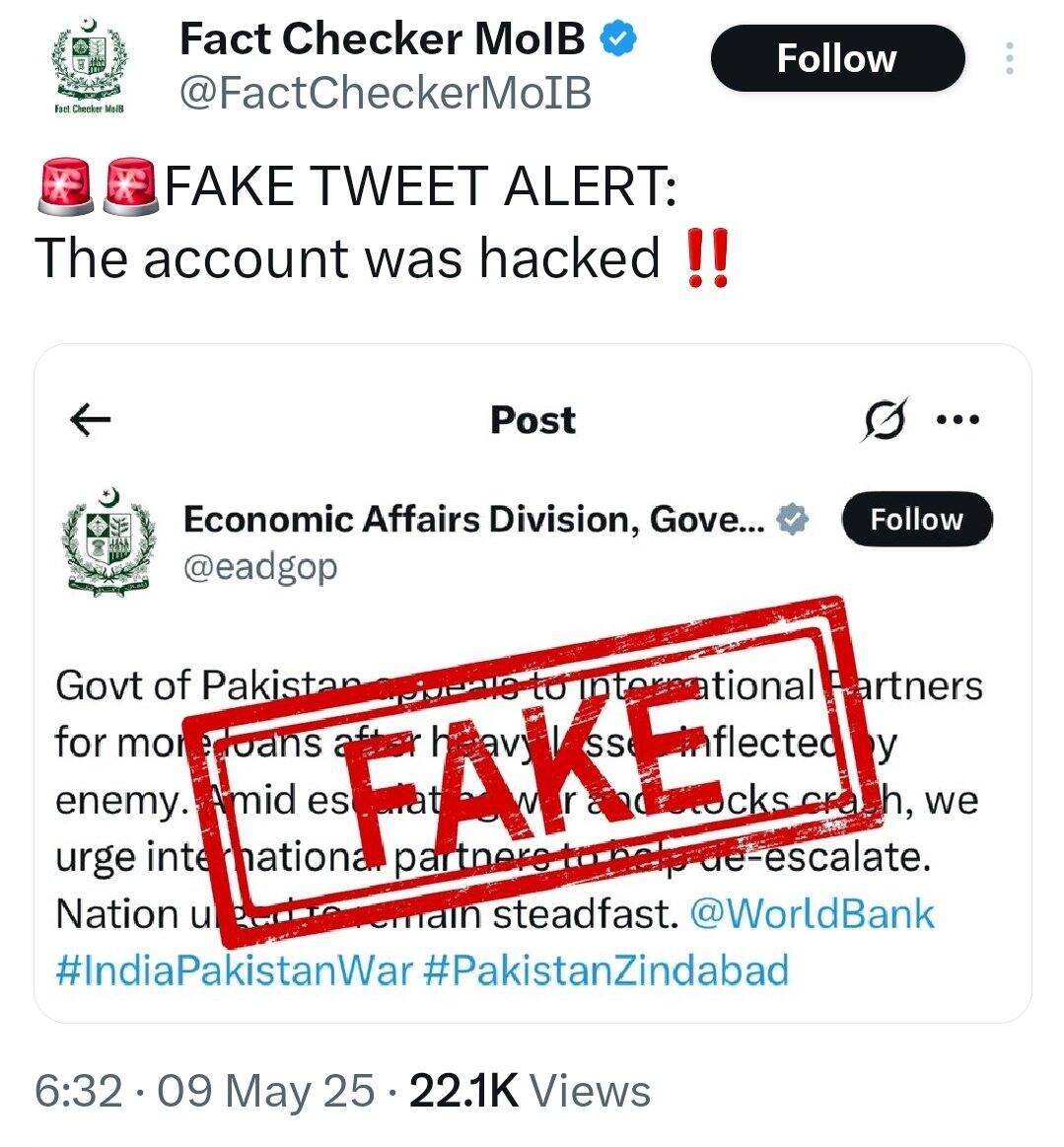 பாகிஸ்தான் அரசாங்கத்தின் நிதித்துறையின் அதிகாரப்பூர்வ எக்ஸ் பக்கத்தில் வெளியான இந்த பதிவு வைரலானது. அத்துடன் பாகிஸ்தான், இந்தியாவுக்கு எதிரான போர் நிலைப்பாட்டில் இருந்து பின்வாங்க தொடங்கியுள்ளது என்றும் எதிர்பார்க்கப்பட்டது. ஆனால் கொஞ்ச நேரத்திலேயே பாகிஸ்தான் நிதித்துறையின் அதிகாரப்பூர்வ எக்ஸ் தளம் ஹேக் செய்யப்பட்டிருப்பதாகவும், பாகிஸ்தான் இப்படியான கோரிக்கை ஏதும் வைக்கவில்லை என்றும் அந்நாடு விளக்கமளித்துள்ளது. பாகிஸ்தான் அரசின் உண்மை கண்டறியும் துறை இதுகுறித்து விளக்கமளித்திருக்கிறது. அதேநேரத்தில் பாகிஸ்தான் தங்களுக்கான நிதித்தேவையை பூர்த்தி செய்து கொள்ள உலக நாடுகளுடன் பேச்சுவார்த்தை நடத்தி வருவதாக தகவல் வெளியாகியுள்ளது.