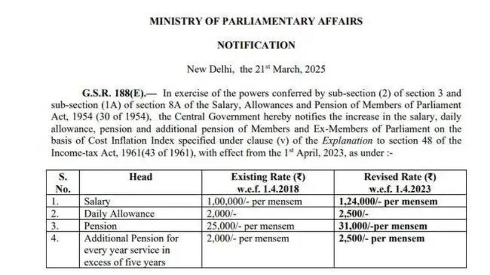 மக்களவை உறுப்பினர்கள், மாநிலங்களவை உறுப்பினர்கள், முன்னாள் நாடாளுமன்ற உறுப்பினர்கள் ஆகியோரின் சம்பளம், தினசரி கொடுப்பனவு, ஓய்வூதியம் மற்றும் கூடுதல் ஓய்வூதியம் குறித்த அப்டேட் இன்று வந்துள்ளது.