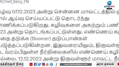 Chennai Relief Funds: சென்னை எண்ணூர் எண்ணெய் கழிவுகளால் பாதிக்கப்பட்ட மக்களுக்கு 6 ஆயிரம் ரூபாயுடன், 12 ஆயிரத்து 500 ரூபாயும் நிவாரணமாக வழங்கப்படும் என புயல் மழை கண்காணிப்பு அதிகாரி கந்தசாமி ஐஏஎஸ் தெரிவித்தார்.